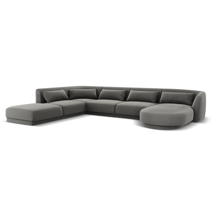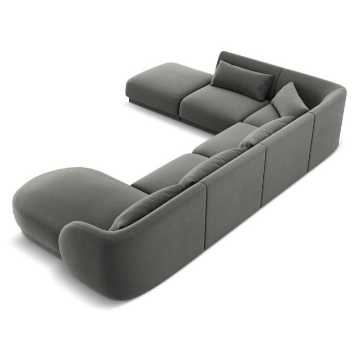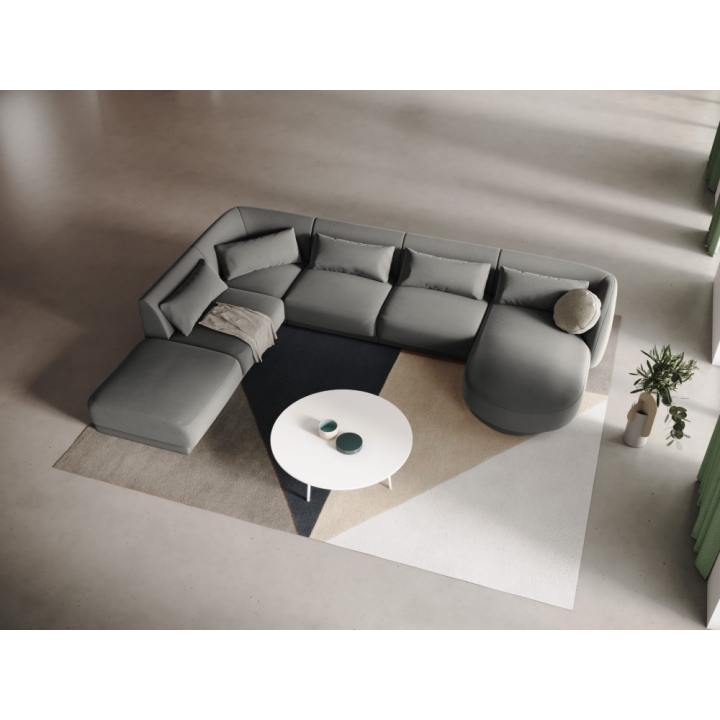 The 6-seater Tulum Velour Cosmopolitan-design corner sofa is a spacious, modern piece of furniture that is perfect for large living rooms. Its rounded shapes and low plastic legs, which are almost invisible, give it a light and subtle character. The width of the corner sofa is 330cm, the depth of one side is 255cm and the other 156cm, the total height is 70cm and the seat height is 40cm, ensuring a comfortable rest. The model is available in a left or right-hand version to match the interior layout. The upholstery in Bluvel velour fabric, available in various colours, is characterised by its exceptional softness and elegant sheen.