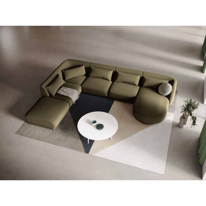 The 6-seater Tulum Velour Cosmopolitan-design corner sofa is a spacious, modern piece of furniture that is perfect for large living rooms. Its rounded shapes and low plastic legs, which are almost invisible, give it a light and subtle character. The width of the corner sofa is 330cm, the depth of one side is 255cm and the other 156cm, the total height is 70cm and the seat height is 40cm, ensuring a comfortable rest. The model is available in a left or right-hand version to match the interior layout. The upholstery in Bluvel velour fabric, available in various colours, is characterised by its exceptional softness and elegant sheen.