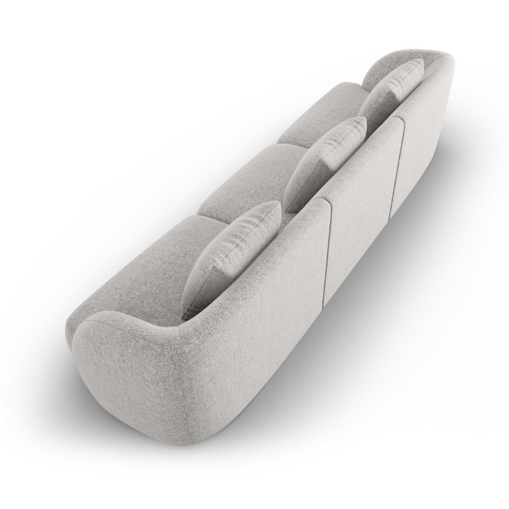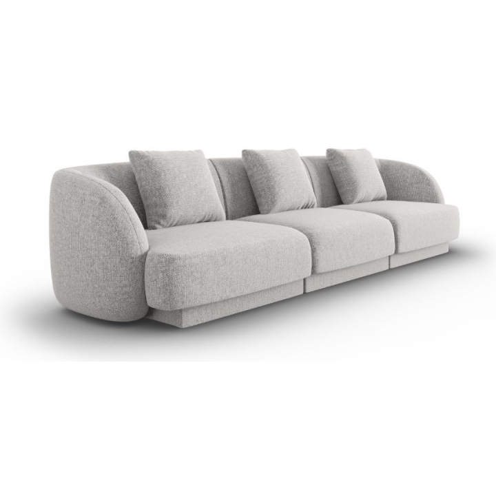 The Tulum Shenil Cosmopolitan-design 3-seater sofa is a modern model with a rounded shape that fits perfectly into stylish and designer interiors. With a width of 255 cm, a depth of 90 cm, a height of 70 cm and a seat height of 40 cm and its depth of 65 cm, it provides a comfortable rest. The upholstery in Haga chenille fabric, available in a wide range of colours, is distinguished by its subtle 3D effect and soft sheen. Three decorative cushions are included to enhance the aesthetics of the furniture. The low black plastic legs, almost invisible, add lightness to the sofa and emphasise its modern design.