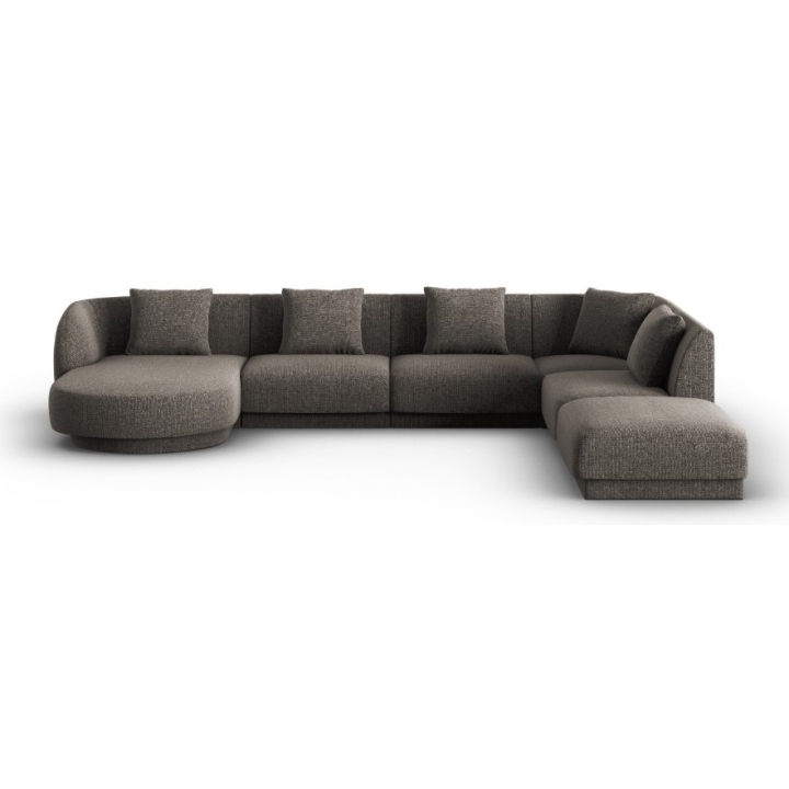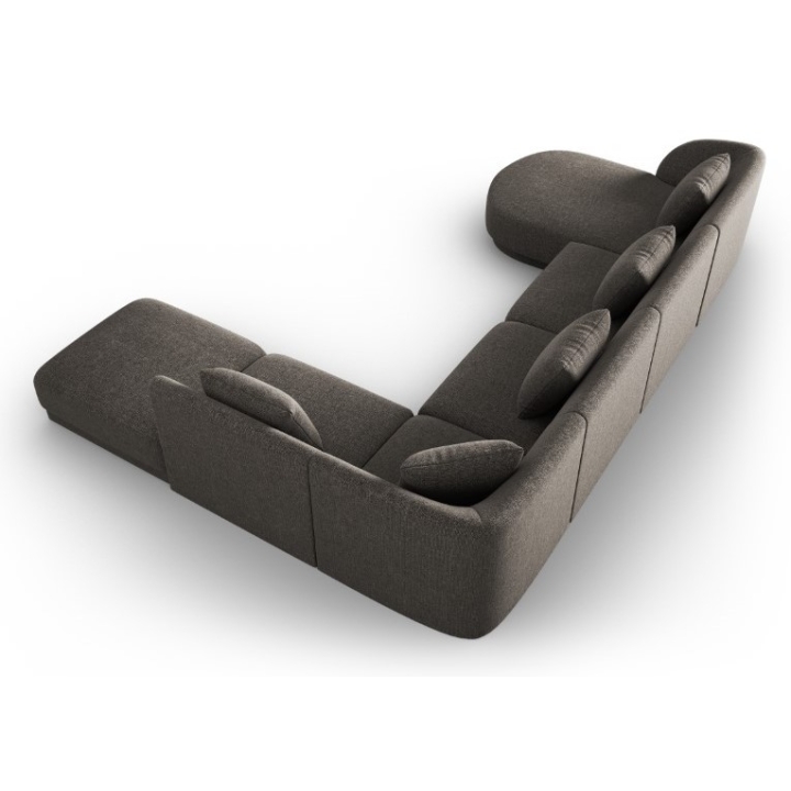 The Tulum Shenil Cosmopolitan-design 6-seater corner sofa is a large, comfortable corner sofa that is perfect for spacious living rooms. With a width of 330 cm, a depth of one side of 255cm( usable 230cm) and the other side of 156 cm( usable 125cm) a height of 70 cm and a seat height of 40 cm provide a comfortable place to relax. The model is available in a left and right version, which allows for a perfect match with the interior layout. The upholstery in Haga chenille fabric, available in a wide range of colours, is distinguished by its 3D effect, subtle gloss and high abrasion resistance (60,000 Martindale cycles). The low plastic legs give the corner sofa a light and elegant look.