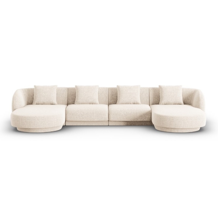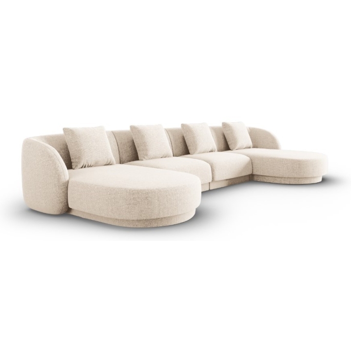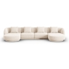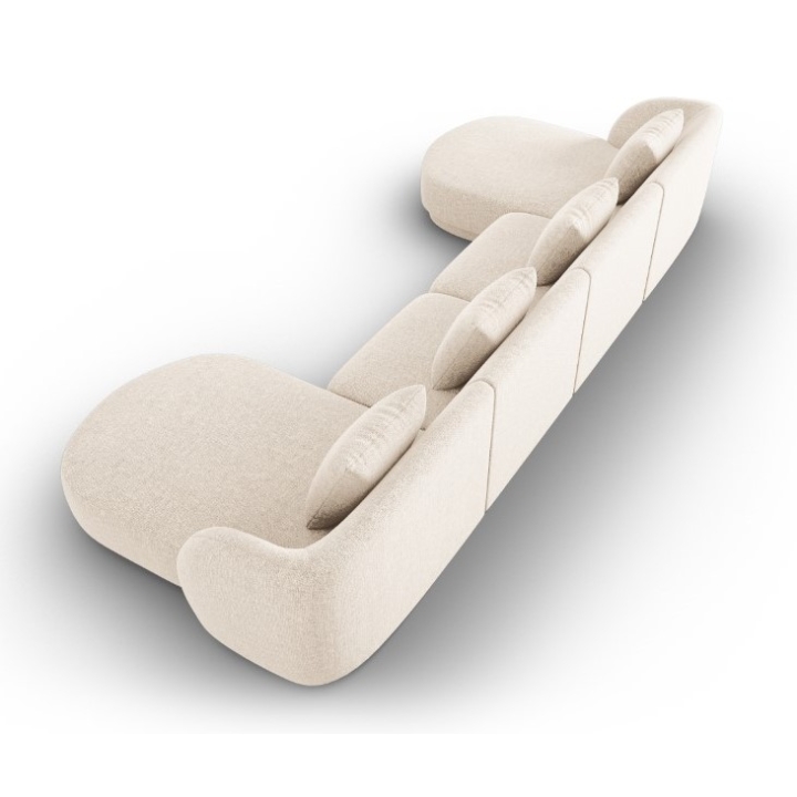 The Tulum Shenil Cosmopolitan-design 5-seater panoramic corner sofa is a modern model with an oval shape that provides comfortable relaxation and blends perfectly with interiors decorated in a minimalist and designer style. The width of the corner sofa is 330 cm, the depth of both sides is 156 cm, the height is 70 cm and the seat height is 40 cm, which makes it an ideal choice for those who value spaciousness and comfort. The longer parts of the corner sofa, in the form of recliners, are 156 cm deep and 125 cm high, allowing you to stretch your legs out comfortably and fully relax. The lack of a sleeping function and a bedding container makes this model intended for everyday use.