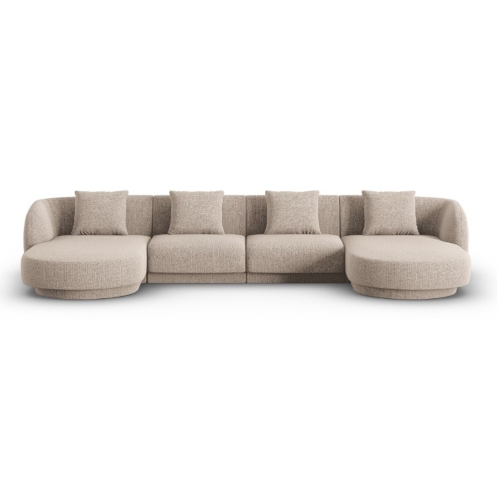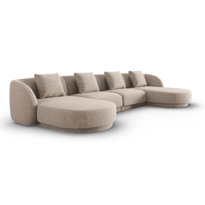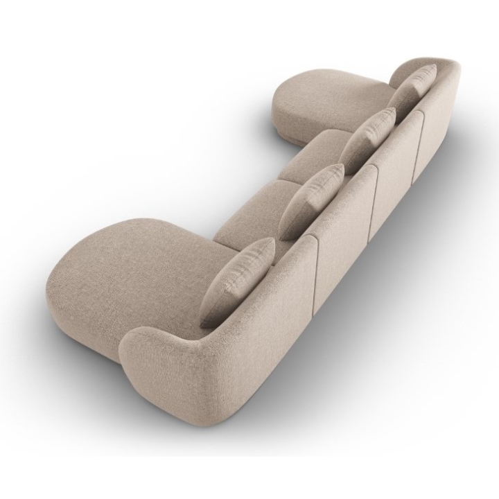 The Tulum Shenil Cosmopolitan-design 5-seater panoramic corner sofa is a modern model with an oval shape that provides comfortable relaxation and blends perfectly with interiors decorated in a minimalist and designer style. The width of the corner sofa is 330 cm, the depth of both sides is 156 cm, the height is 70 cm and the seat height is 40 cm, which makes it an ideal choice for those who value spaciousness and comfort. The longer parts of the corner sofa, in the form of recliners, are 156 cm deep and 125 cm high, allowing you to stretch your legs out comfortably and fully relax. The lack of a sleeping function and a bedding container makes this model intended for everyday use.