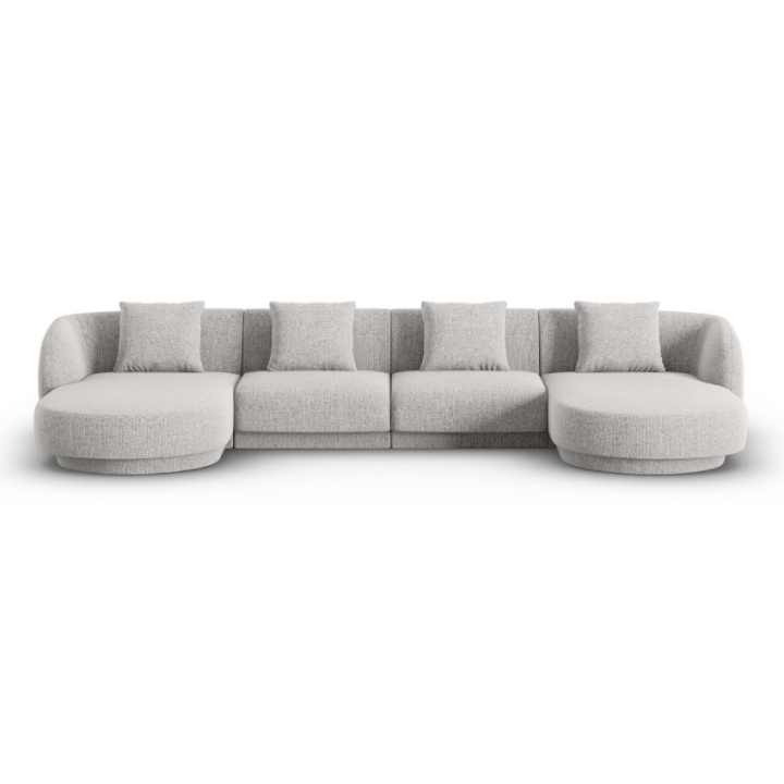 The Tulum Shenil Cosmopolitan-design 5-seater panoramic corner sofa is a modern model with an oval shape that provides comfortable relaxation and blends perfectly with interiors decorated in a minimalist and designer style. The width of the corner sofa is 330 cm, the depth of both sides is 156 cm, the height is 70 cm and the seat height is 40 cm, which makes it an ideal choice for those who value spaciousness and comfort. The longer parts of the corner sofa, in the form of recliners, are 156 cm deep and 125 cm high, allowing you to stretch your legs out comfortably and fully relax. The lack of a sleeping function and a bedding container makes this model intended for everyday use.
