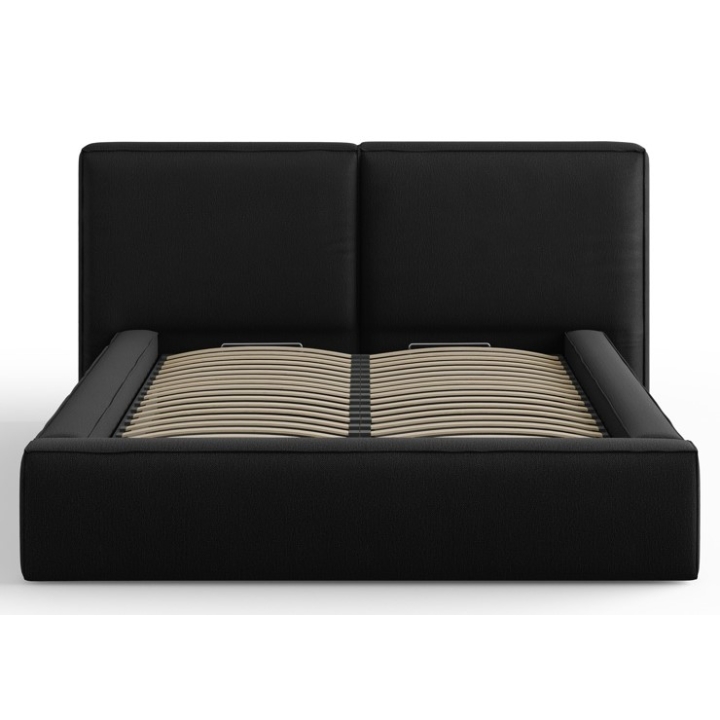 The 200x200 upholstered bed with storage box by Cosmopolitan Design is characterised by its careful construction and finely crafted details that enhance its character. The width of the furniture is 254 cm, the depth is 228 cm and the overall height reaches 98 cm. The spacious sleeping area of 200x200 cm provides comfort when resting. The headrest consists of two parts with a height of 61 cm, and its interior is filled with polyurethane foam with a density of 25 kg/m³, guaranteeing stable back support. The whole is set on subtle black legs, 2 cm high, which add lightness to the structure, raising it gently above the floor.