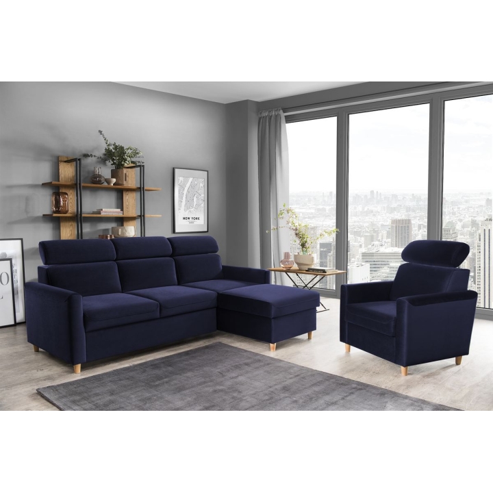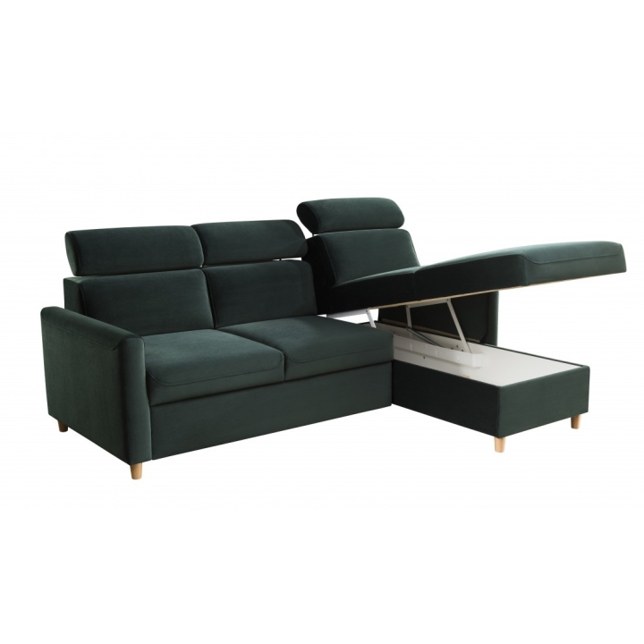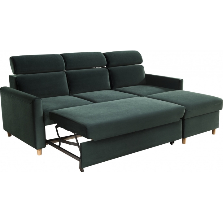The product is available in many variants (Classic, Perfect, Elegance, Prestige, Exclusive). It has legs made of wood. The height is 90-97 cm, the width is 220 cm, the depth is 160 cm and the sleeping area is 195x130 cm.