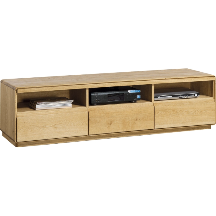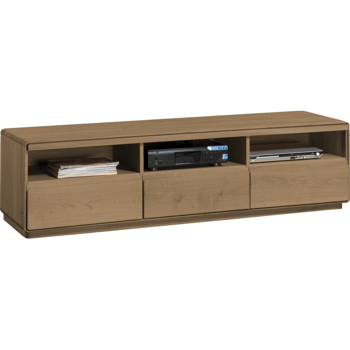 The Type 25 TV cabinet from Dekort's Atlanta collection is a simple and modern form of furniture, with slightly curved edges and brushed fronts. The furniture has three functional drawers and three rubbed shelves for electronic equipment. The cabinet has been made from high quality materials so that it stands out for its exceptional quality and durability. Two colour variants are available: burnt oil and nature oil. The furniture from the ATLANTA collection will fit into almost any type of interior thanks to its universal, modern design.