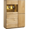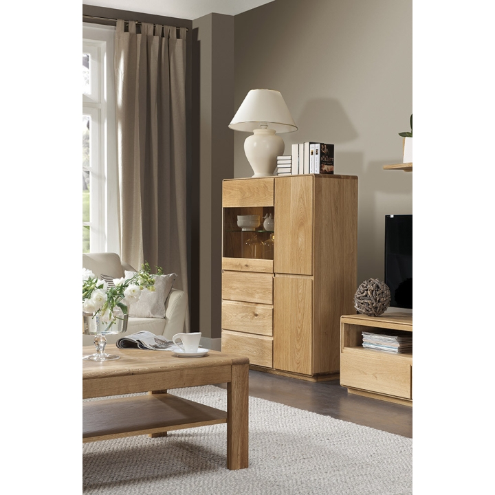 The Atlanta Type 45 sideboard is a modern and fictional chest piece of furniture that will fit perfectly into a living room or dining room arrangement. The sideboard is characterised by an interesting design, which certainly makes it stand out from other furniture. Its advantage is its large capacity, which allows you to store tableware or home textiles. It features a glazed door and a wooden door behind which there are numerous shelves for storage. The glazed upper part allows for a unique display of selected pieces of tableware. In addition, the furniture is available in two natural colours: burnt oil and natural oil. The sideboard is made of solid oak wood and veneered furniture board, which guarantees durability and aesthetic appearance for many years of use. The presented offer does not include lighting, lighting is an option for an additional fee. Please contact the seller to order it and check the price.