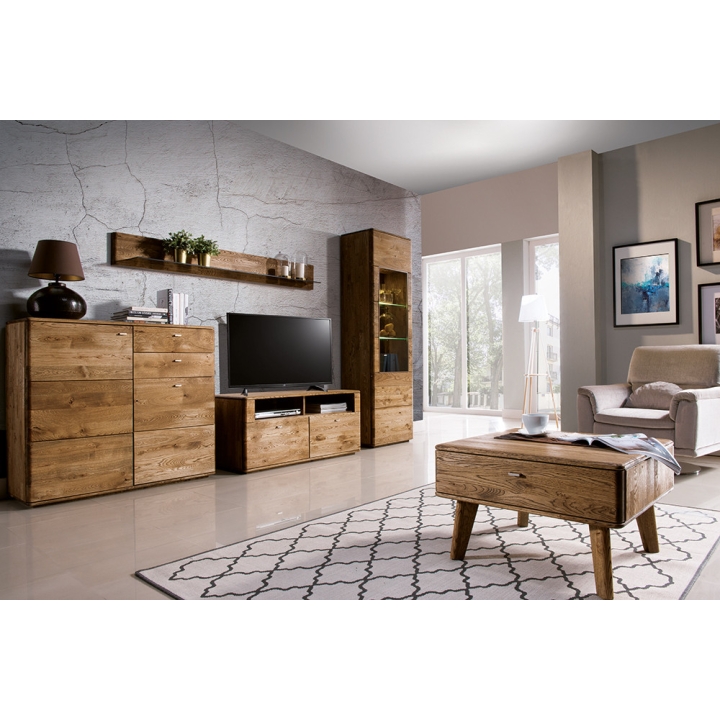 The Dallas collection left side display cabinet is the ideal choice for lovers of the smell of authentic wood in the home. The display cabinet captivates with its beautiful style, which, thanks to the natural visible grain and knots, natural cracks will ensure that it is one of a kind. The furniture is made of oiled wood, which is a guarantee of stability and solid construction. The Dallas cabinet is not only a practical model, but also a decorative one. All the edges of the cabinet are rounded, giving the impression of a more subtle form. The Type 10 left sideboard also has wooden fronts, with a glazing in the middle, which allows any ornaments to be exposed. The offer does not include lighting, lighting is an option for an additional fee. Please contact the seller to order it or check the price.