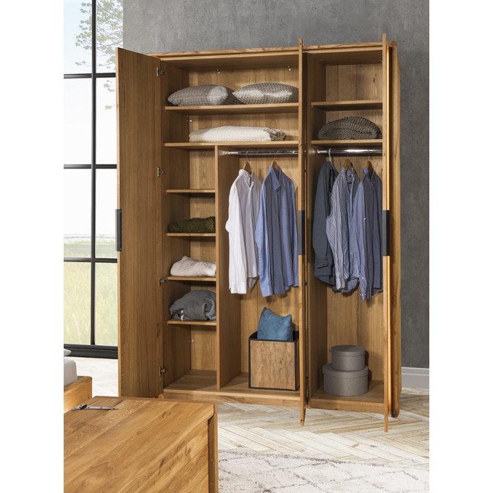 Denver three-door wardrobe type 03 from the manufacturer Dekort is a timeless design. A large wardrobe with a division into two parts: a two-door part and a one-door part.In each part inside there are two shelves and 1 bar for hangers as standard. Such a functional space provides plenty of room for storing clothes and other wardrobe items. The Type 03 wardrobe from the Denver collection may be additionally equipped with shelves, lighting, an internal cabinet with three drawers or an internal shelf with three shelves and a rod.The wardrobe is made of solid wood of the highest quality, which ensures durability and long use. The furniture will perfectly fit into modern, rustic and industrial interiors. This offer does not include the bookcase with three shelves and a bar shown in the photo. Inner bookcase, inner cabinet and lighting are additional and extra paid options. Please contact the seller to order them and to check the price.