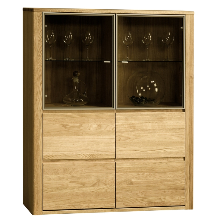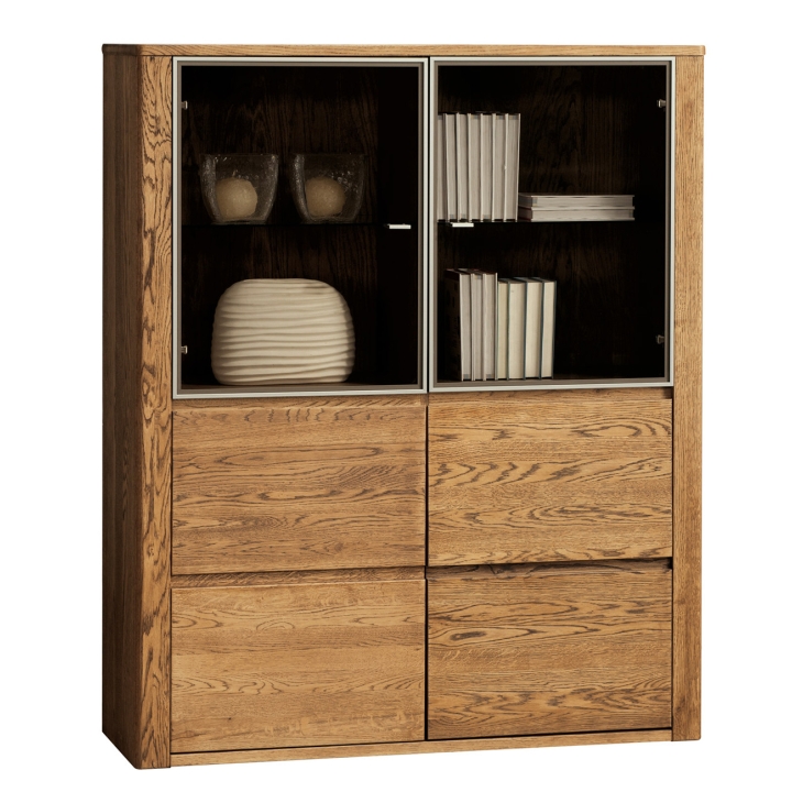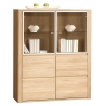 TheOrlando Type 05 cabinet is a modern and functional piece of furniture, which is perfect for modern interiors where simple forms and minimalism reign supreme. The Orlando cabinet has been made of top quality raw materials in the form of oak wood and veneered furniture board, which guarantee great durability. The structure of the cabinet consists of 4 doors. There are two cabinets with wooden fronts and two with glazed fronts. The interior is equipped with as many as eight shelves, two of which are glass. Such a spacious space is great for storing things as well as displaying ornaments. The Orlando cabinet is available in a choice of three colours: oil natura, oil bianco and oil amber. The offer does not include lighting. Lighting is an extra charge option, please contact the seller to order it or check the price.