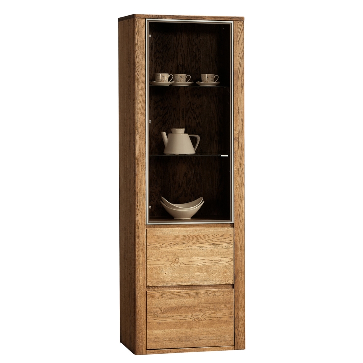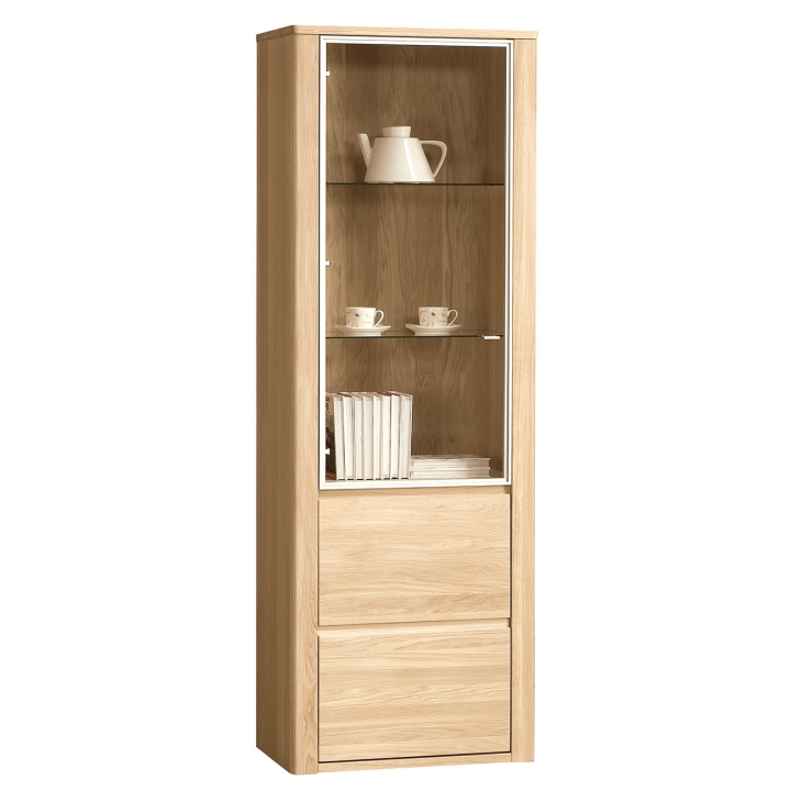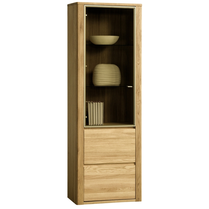 Single left side vitrine from Dekort'sOrlando Type 10collection is a stylish piece of furniture that will perfectly complement bright, modern spaces. The vitrine is equipped with a glazed front and a wooden one. The glazed part has glass shelves on which you can display ornaments, souvenirs or china crockery. The Orlando display cabinet is a combination of modernist style and high-quality raw materials. The furniture is made of solid oak wood and veneered furniture board. In addition, it is available in three light colours to choose from: amber, natura and bianco. The furniture will add character, functionality and warmth to the interior. The offer does not include lighting. Lighting is an extra charge option, please contact the seller to order it or check the price.