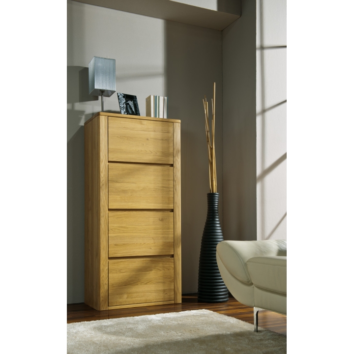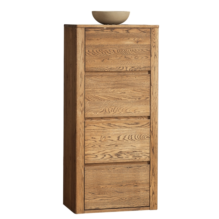 The cabinet from the Orlando collection by Dekort is a simple form in an elegant design. The piece of furniture is very fucnjoanl, as it has been equipped with four capacious drawers, in which you can store the necessary things. You can place interesting decorations on the small top. The chest of drawers was made of the best raw materials in the form of oak wood and veneered furniture board, so you can definitely say that it is an investment for years. An additional advantage of the furniture is the choice of staining, with a choice of natura oil, amber oil and bianco oil.