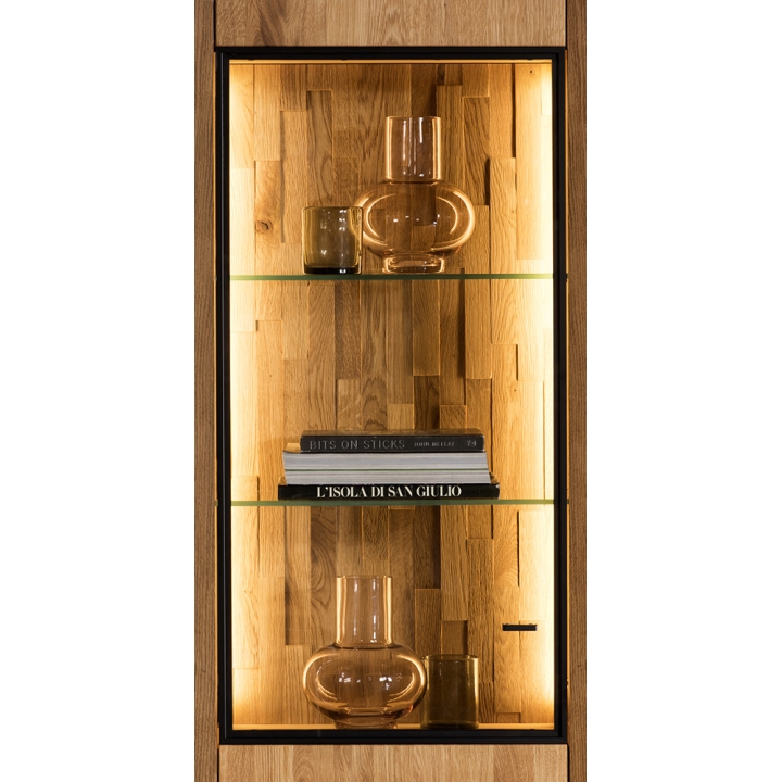 The Vigo type 10 left side display cabinet is a modern piece of furniture that combines wooden elements with black accents. The display cabinet has a lot of storage space and the glass part of the door makes it possible to display decorative accents, souvenirs, photos. LED lighting adds to the charm. Thanks to the natural colours of the wooden and veneered elements, the cabinet will give a cosy and warm character to the interior. It will be perfect for the living room, dining room and study.