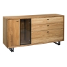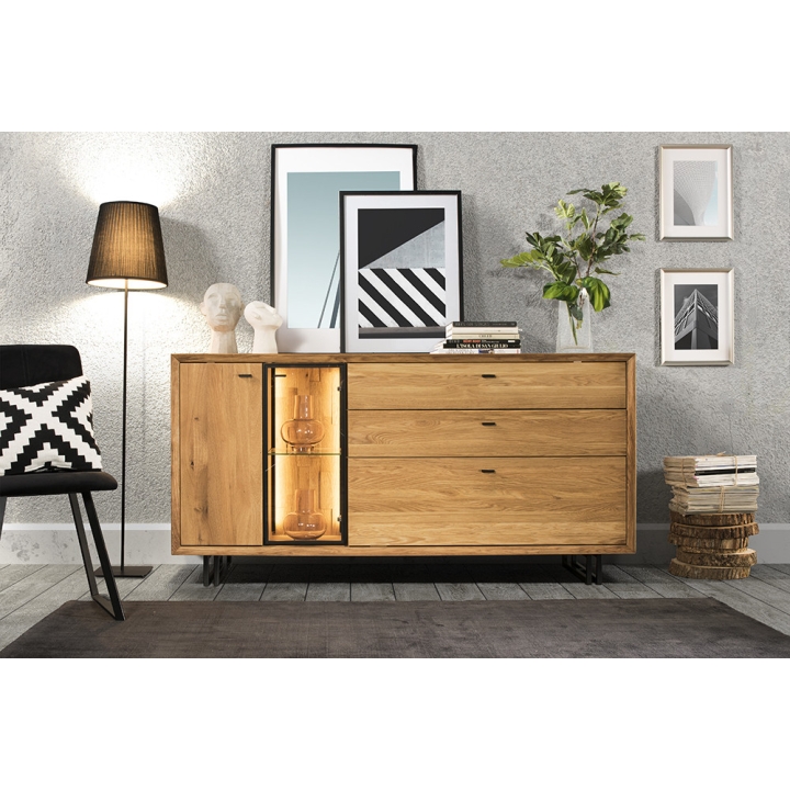 The stylish Vigo Type 49 chest of drawers will find its way into almost any interior design. This is all thanks to its natural colouring with visible wood grain and black metal accents. The overall appearance is very tasteful and elegant. The Vigo Type 49 chest of drawers is not only fantastic looking, but also functional. It has two capacious drawers, two doors, one of which is glazed, and a flap that opens downwards. The chest of drawers can be used in practically any room, living room, bedroom, guest room, as well as in the hallway. The product from the Vigo collection is made of durable materials, so it will not lose its aesthetic and functional qualities for a very long time.
