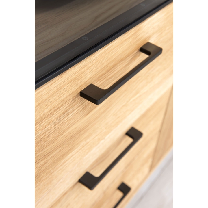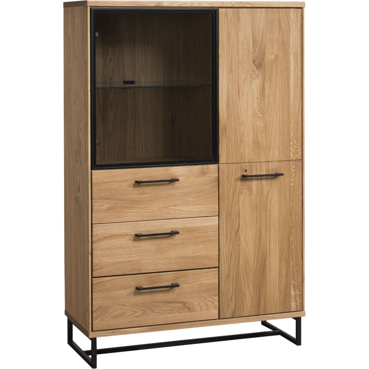 The Lagos 2D2S type 45 standing cabinet by Dekort is a functional and practical piece of furniture that will fit perfectly into a living room, dining room or study decorated in a raw loft or industrial style. The capacious and practical space is guaranteed by two drawers and two closed cabinets, one of which is glazed. Lagos Type 45 cabinet was made of solid oak wood and veneered furniture board, thanks to which it will retain its aesthetic appearance and durability for longer. The structure of the furniture was set on a metal black base. The harmonious combination of brushed solid oak wood and calm metal accents including handles creates a sensual look. This offer does not include lighting, which is an option at extra cost. Please contact the seller to order it or check the price.