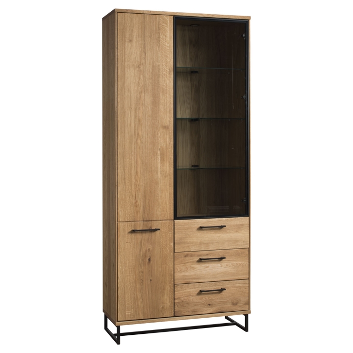 Lagos 2D2S Type 10 by Dekort is a functional and practical piece of furniture that will perfectly fill the free space of a living room, dining room or study, arranged in a raw loft or industrial style. Spacious and practical storage space provided by two drawers and two closed cabinets, one of which is glazed. Lagos Type 10 cabinet was made of solid oak wood and veneered furniture board, thanks to which it will retain its aesthetic appearance and durability for longer. The structure of the furniture was set on a metal black base. The harmonious combination of brushed solid oak wood and calm metal accents including handles creates a sensual look. This offer does not include lighting, which is an option at extra cost. Please contact the seller to order it or check the price.
