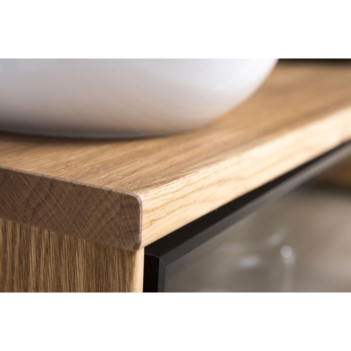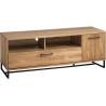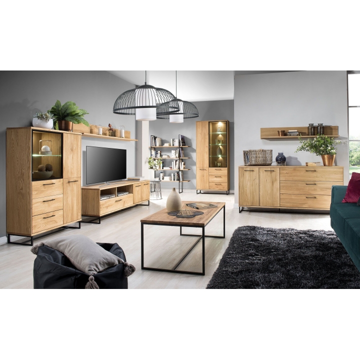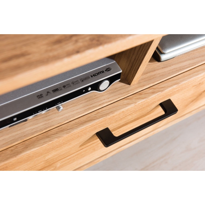 The Lagos 1D1S type 21 RTV cabinet by Dekort undoubtedly stands out in style and adds character to the interior. The cabinet fronts are made of solid brushed oak, while the body is natural oak veneer. What draws attention is the natural, warm colouring of the wood, which, combined with the black metal base and black handles, makes this piece of furniture a unique decoration of the interior. The TV cabinet has a capacious closed section with doors, a large drawer and an open section for equipment.