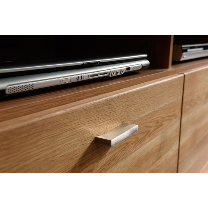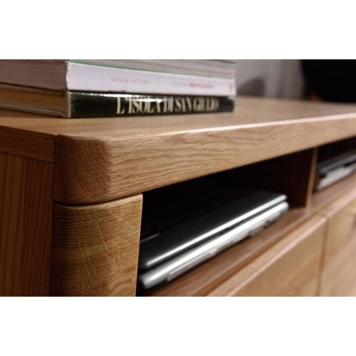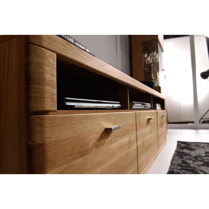 The type 25 RTV cabinet from Dekort 's Boston collection is a modern piece of furniture with a simple and timeless form. The furniture was made from the highest quality materials, thanks to which it is distinguished by durability and strength. The Boston RTV cabinet has three capacious and practical drawers and three open niches for TV equipment. The furniture is available in natural oil colouring.