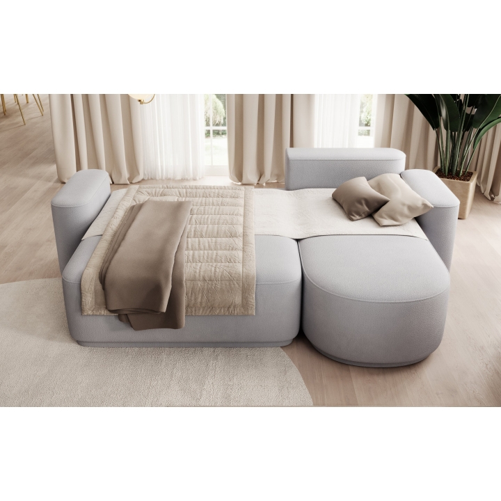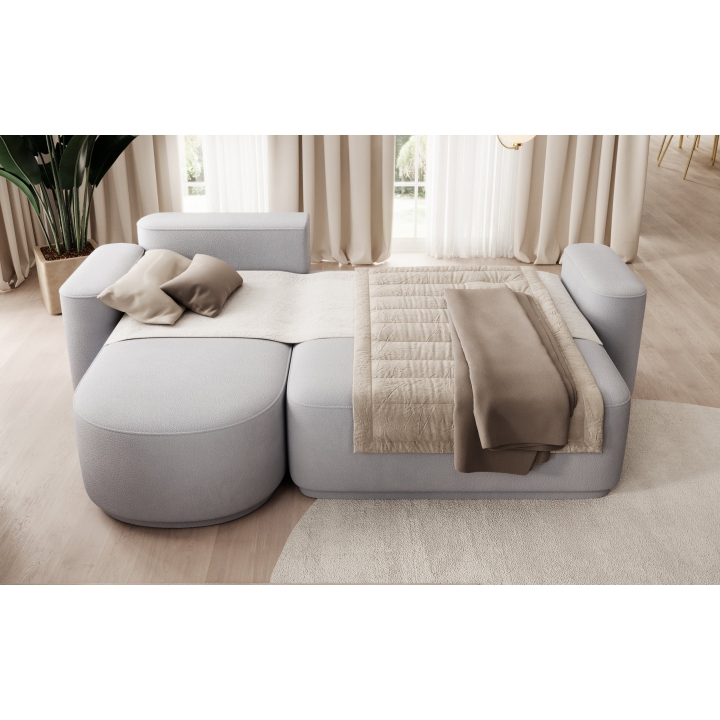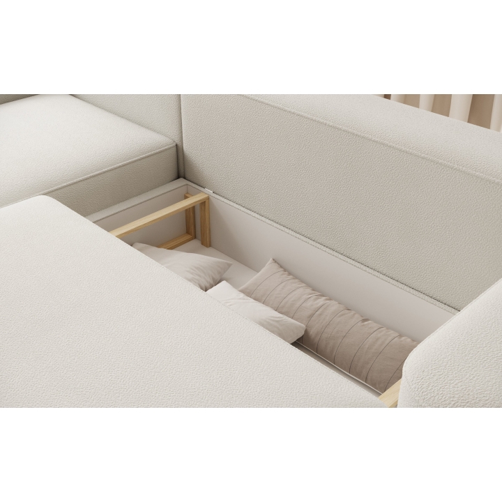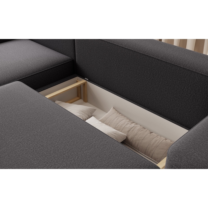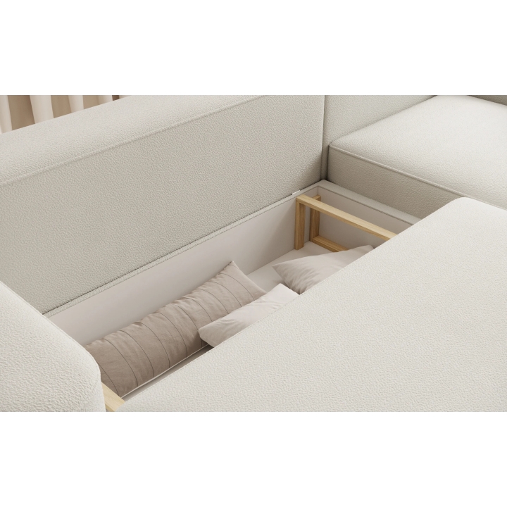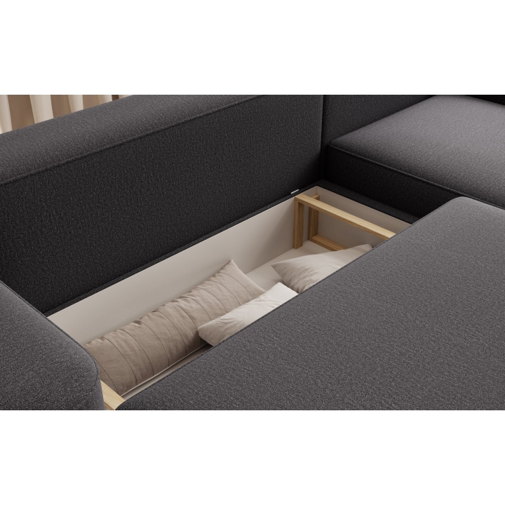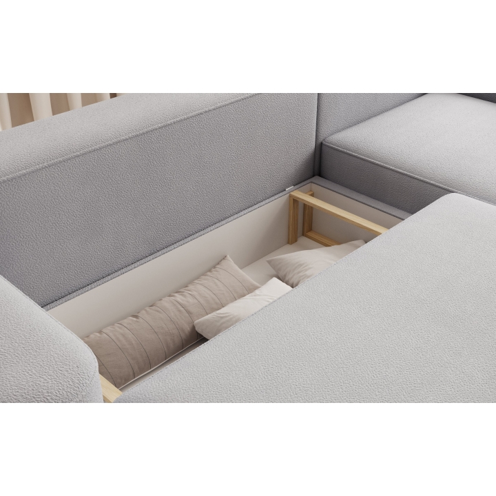 An additional convenience is the bedding container, discreetly integrated into the body of the corner sofa. It allows you to keep things neat and tidy without having to reach for additional storage space. As a result, this model is also ideal for smaller interiors, where every centimetre of free space counts.
