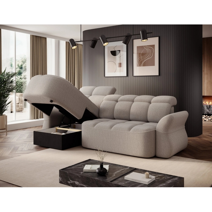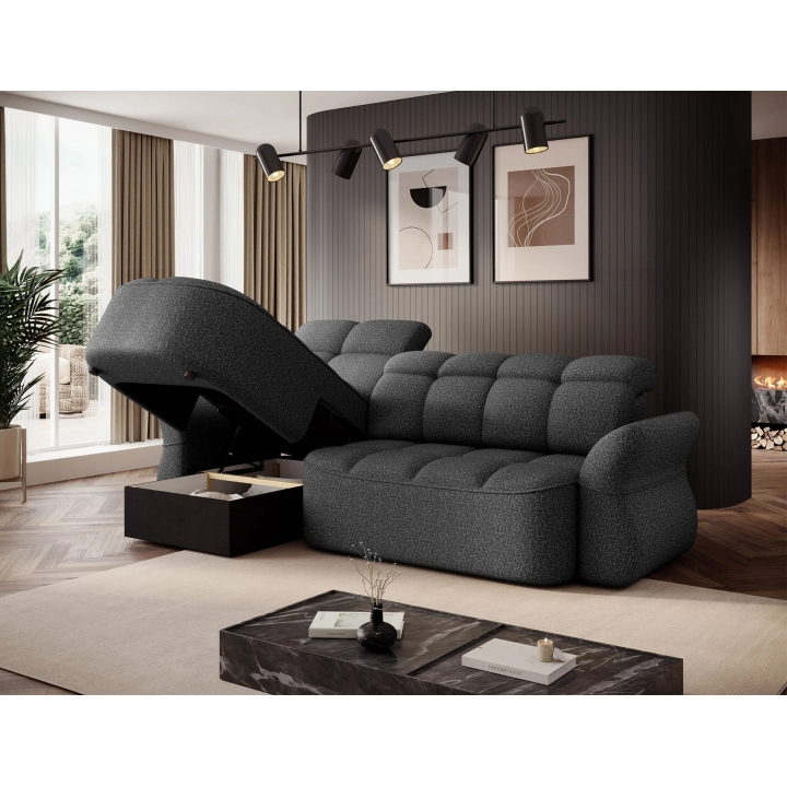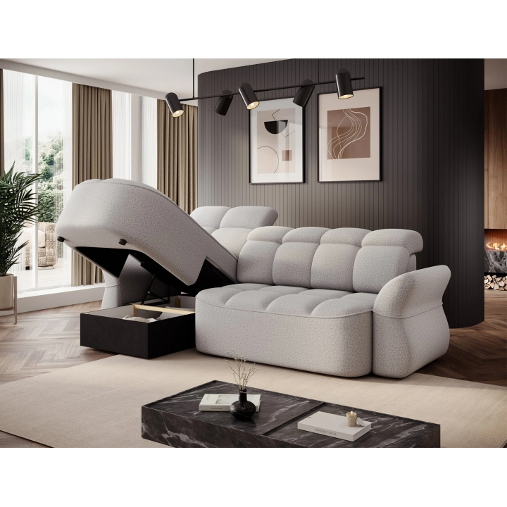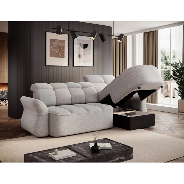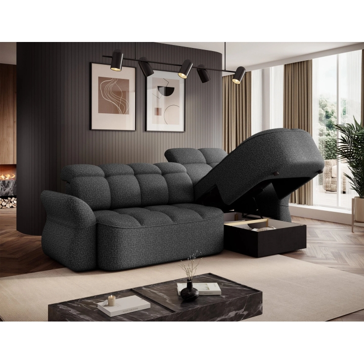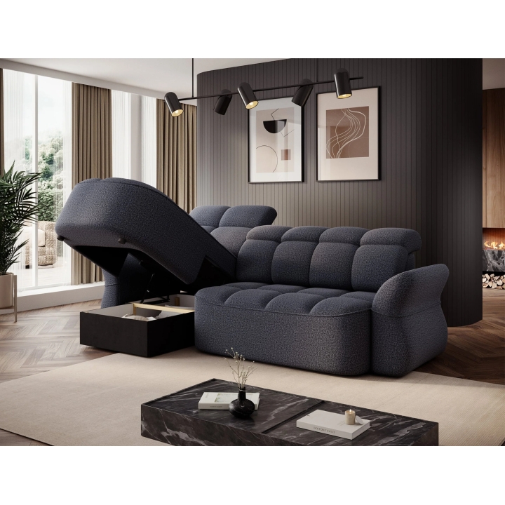 Hidden in the corner section is a bedding container that allows you to store a blanket, pillows or an extra set of sheets. This solution promotes tidiness and better organisation in the living area. The storage compartment opens without much effort and its interior allows the necessary textiles to be conveniently arranged.