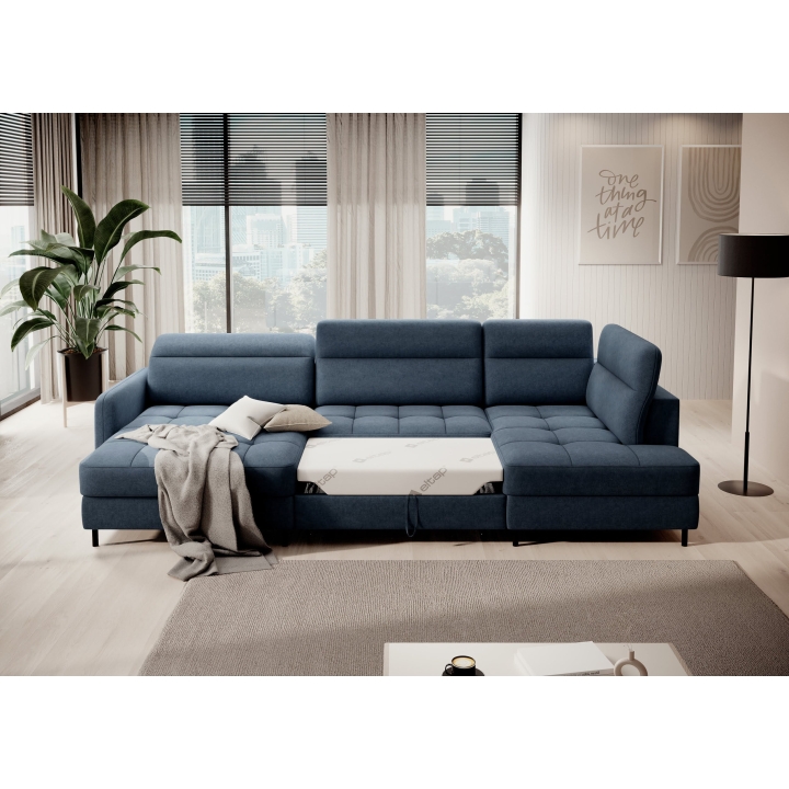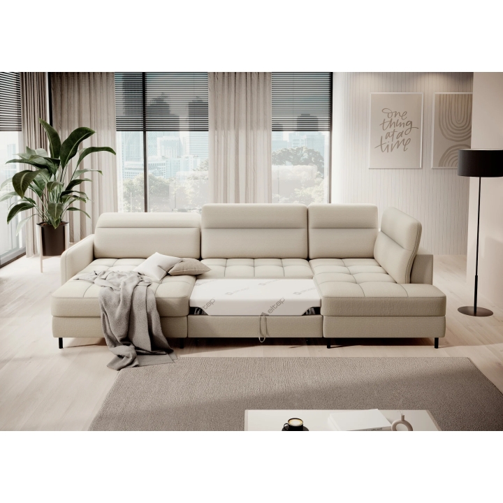 The Berrto model offers a dolphin type sleeping function, which allows the furniture to be quickly transformed into a place for a night's rest. Simply slide out the lower drawer and lift the hidden mattress to obtain a level sleeping surface measuring 130x300 cm. Such a solution allows you to maintain the coherence of the seat with the pull-out section, without having to rearrange the entire living area.