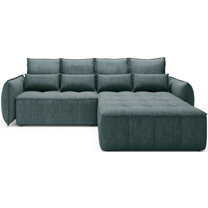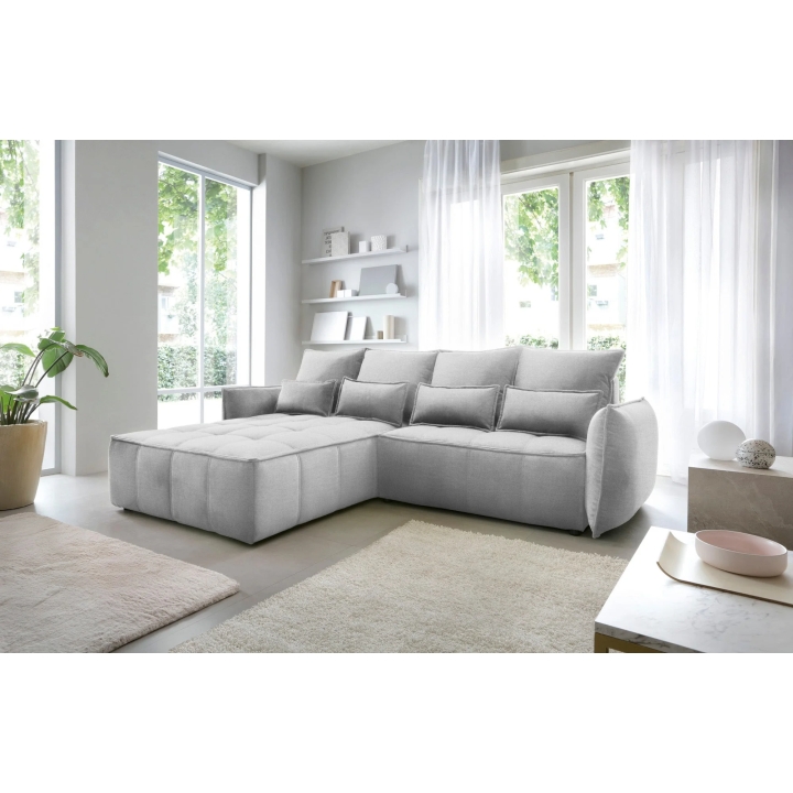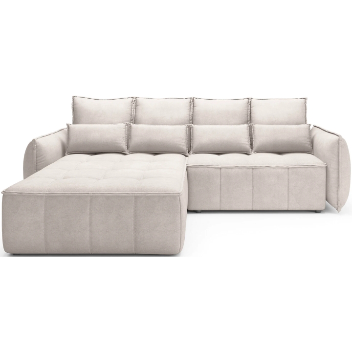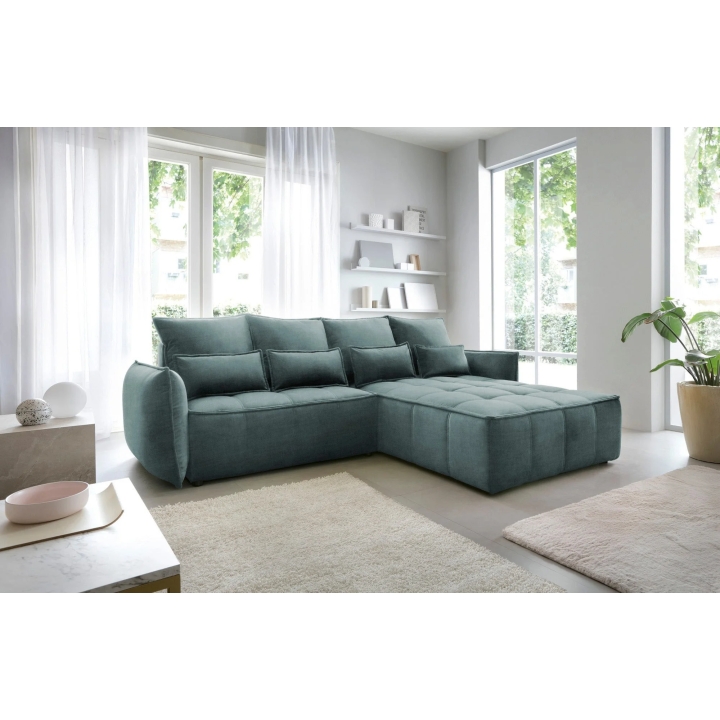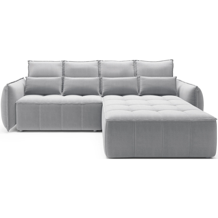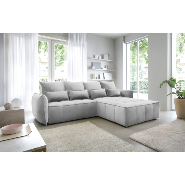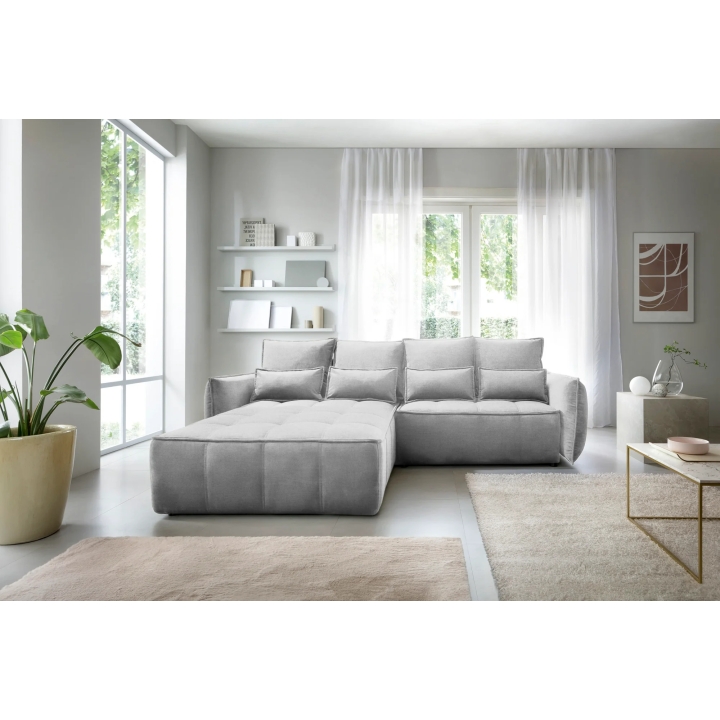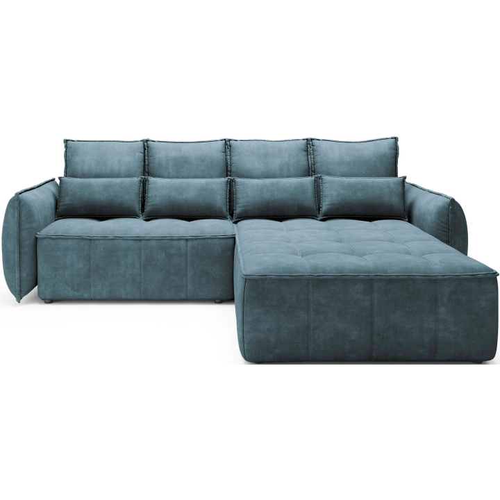 The filling is based on a B-type corrugated spring and high-flexible foam, which translates into adequate support for the body. The corner sofa comes with four 62x52 cm backrest cushions, whose softness ensures comfortable relaxation. The set is complemented by four smaller lumbar c ushions measuring 52x29 cm, serving as a relaxing and decorative element.
