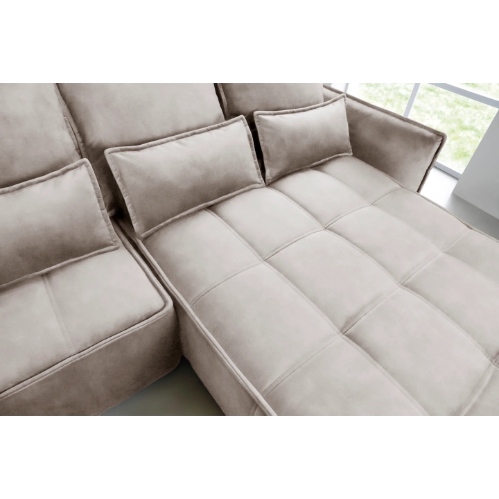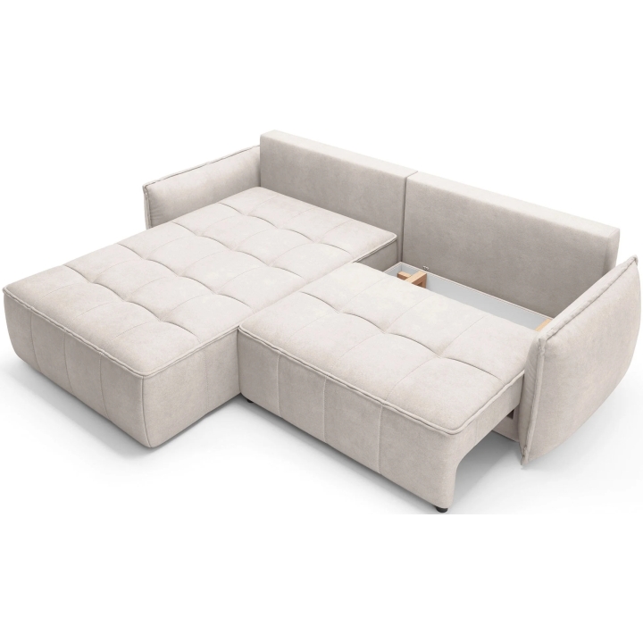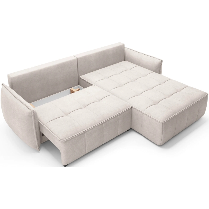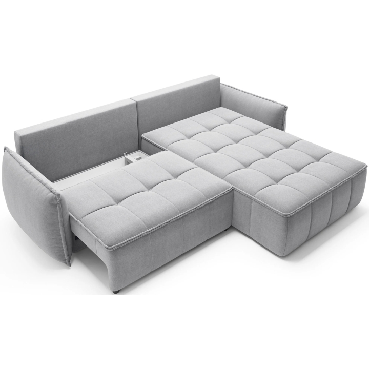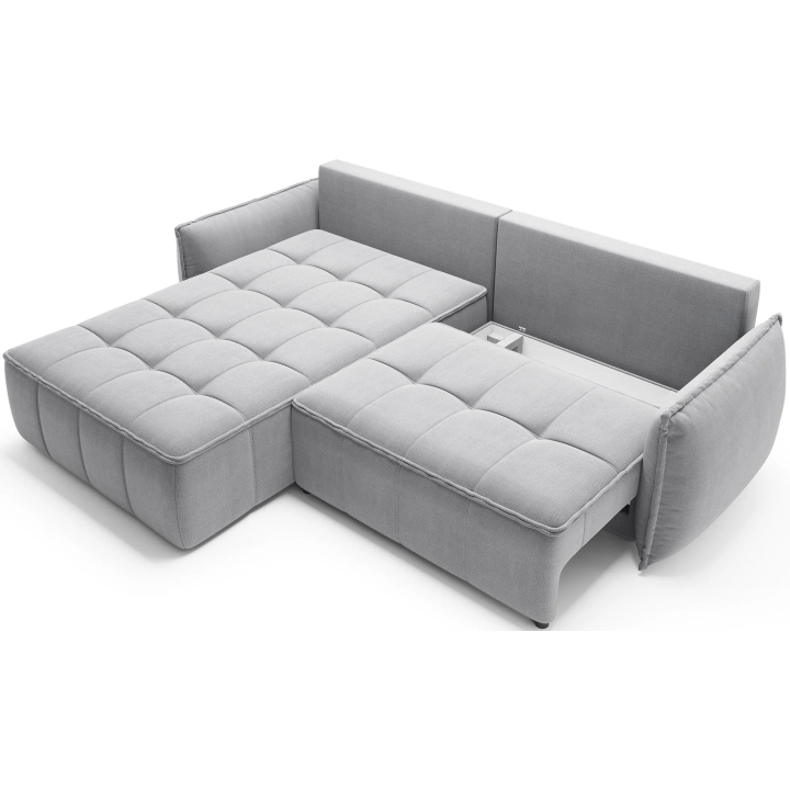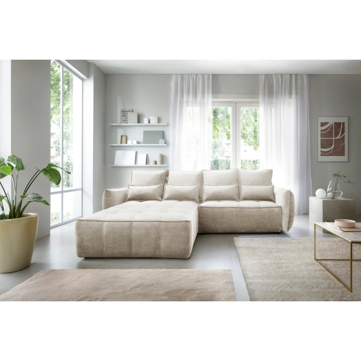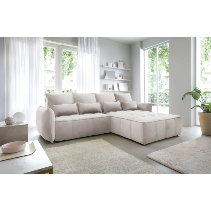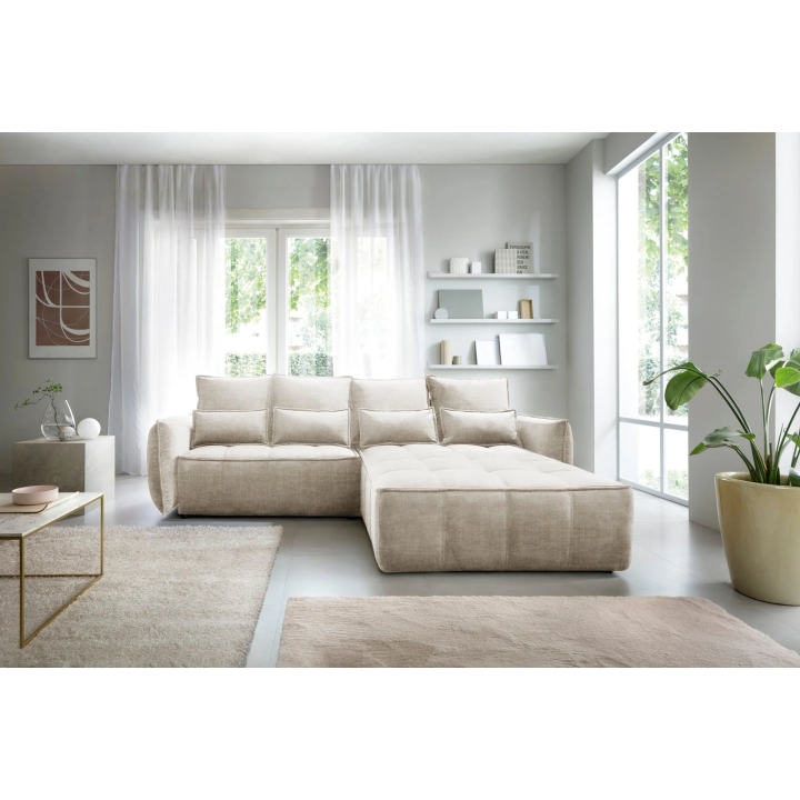 The filling is based on a B-type corrugated spring and high-flexible foam, which translates into adequate support for the body. The corner sofa comes with four 62x52 cm backrest cushions, whose softness ensures comfortable relaxation. The set is complemented by four smaller lumbar c ushions measuring 52x29 cm, serving as a relaxing and decorative element.