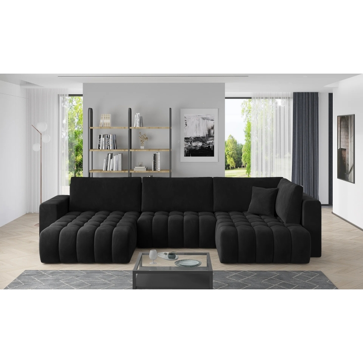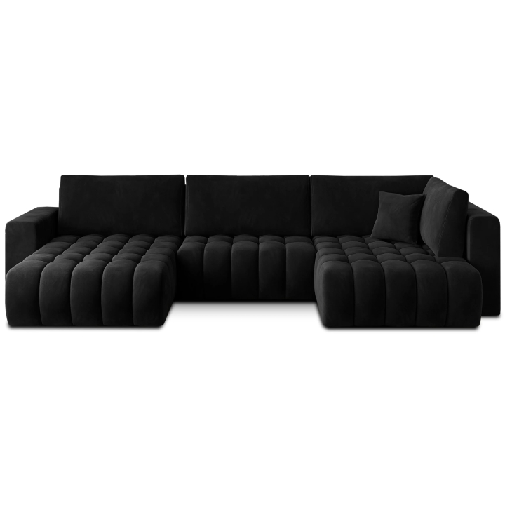 The Bonito corner sofa by Eltap is anelaborate lounge furniture with a U-shaped layout, equipped with two wide ottomans on the sides. Its form is based on a clear contrast - a smooth, uniform backrest with four large cushions is juxtaposed with a seat covered with decorative quilting. The whole is complemented by massive armrests, which optically balance the shape of the corner sofa and play an important role in its everyday use.