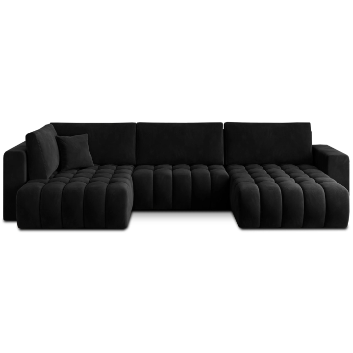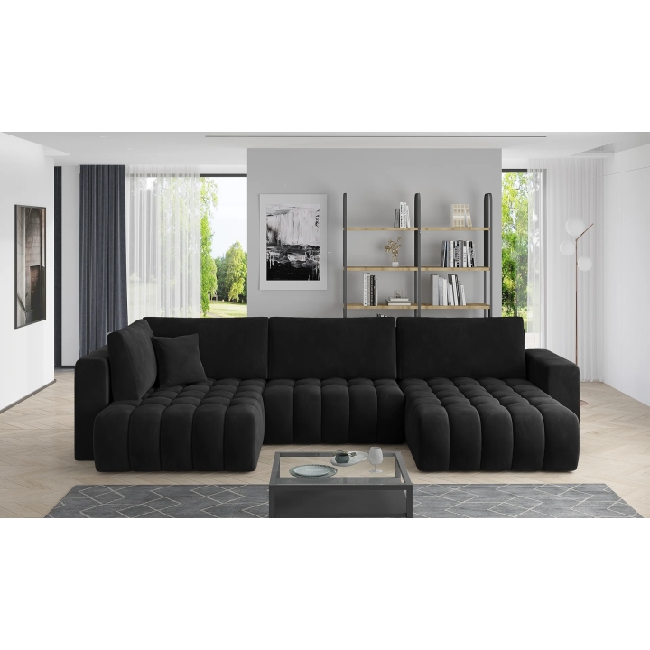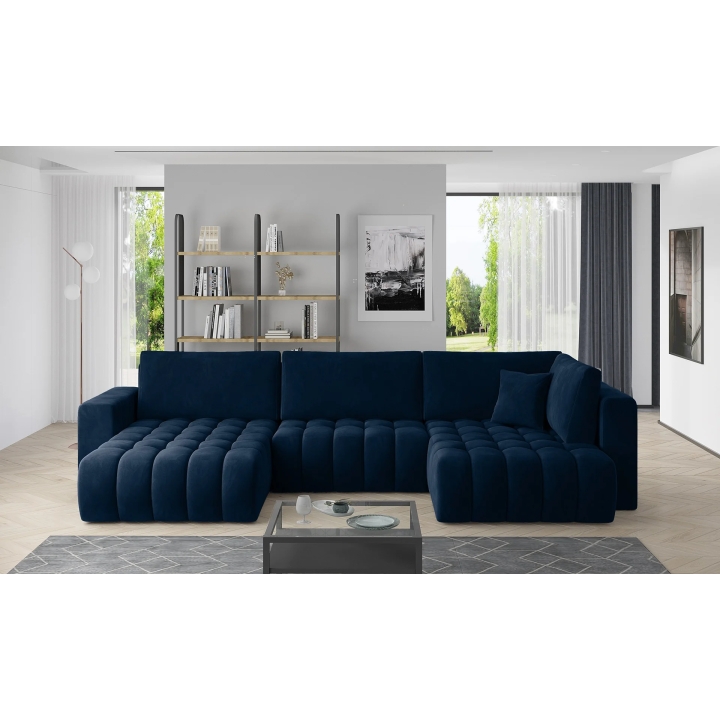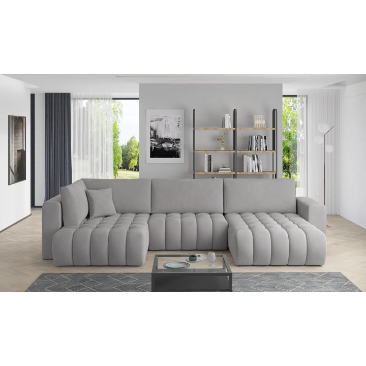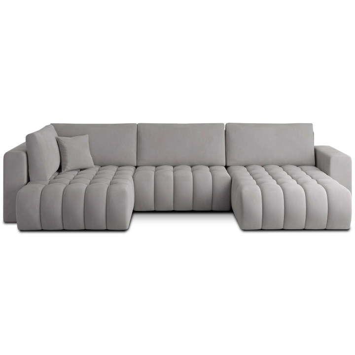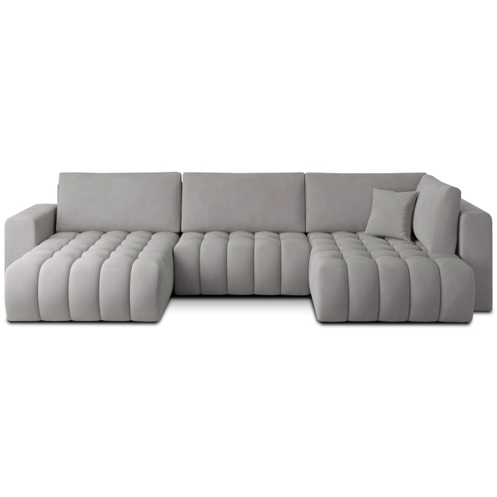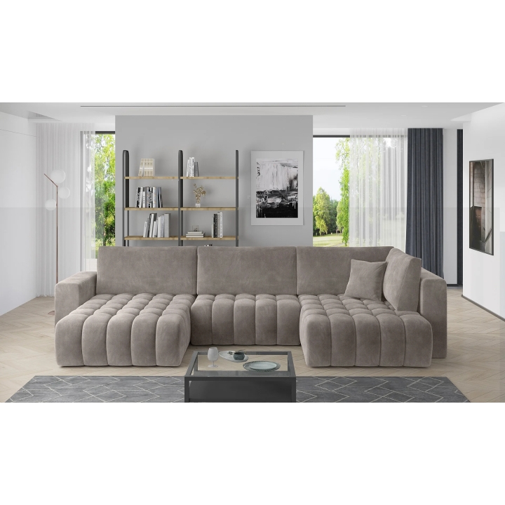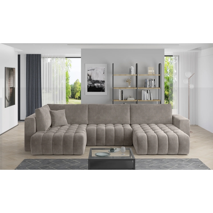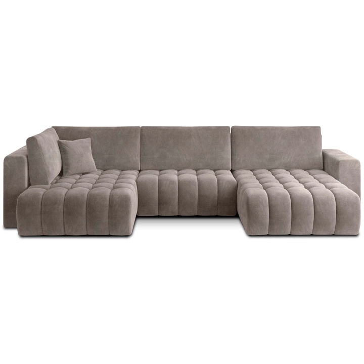 The Bonito corner sofa by Eltap is anelaborate lounge furniture with a U-shaped layout, equipped with two wide ottomans on the sides. Its form is based on a clear contrast - a smooth, uniform backrest with four large cushions is juxtaposed with a seat covered with decorative quilting. The whole is complemented by massive armrests, which optically balance the shape of the corner sofa and play an important role in its everyday use.