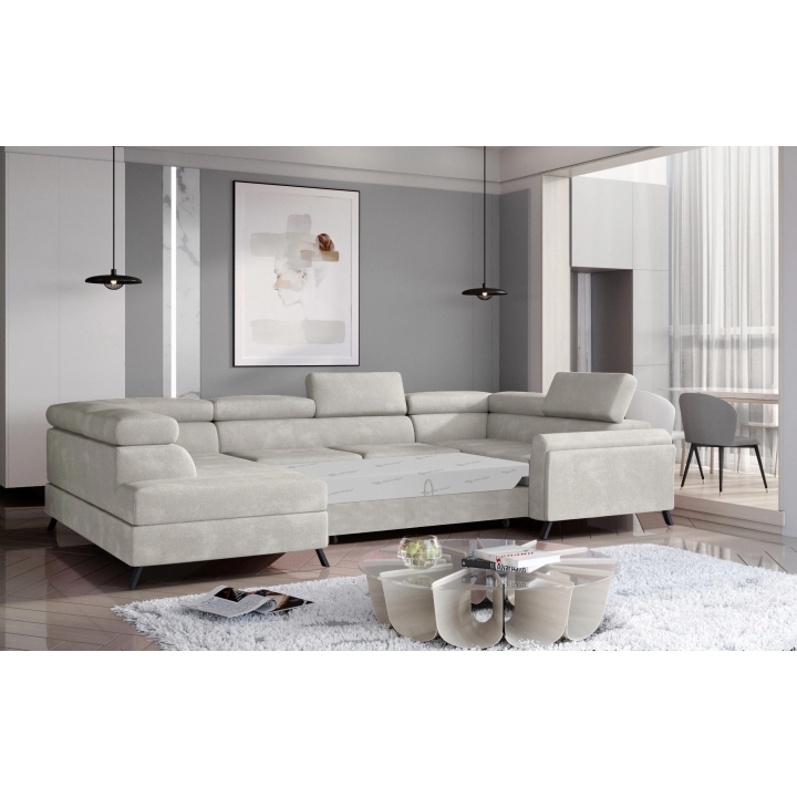 The Escada model is equipped with a dolphin-type sleeping function, which allows the corner sofa to be quickly transformed into a 125x253 cm night rest area. The mechanism works by extending the lower part and lifting the hidden mattress to the level of the seat, creating an even, uniform surface. An additional advantage is the bedding container, thanks to which blankets or pillows can be easily stored.