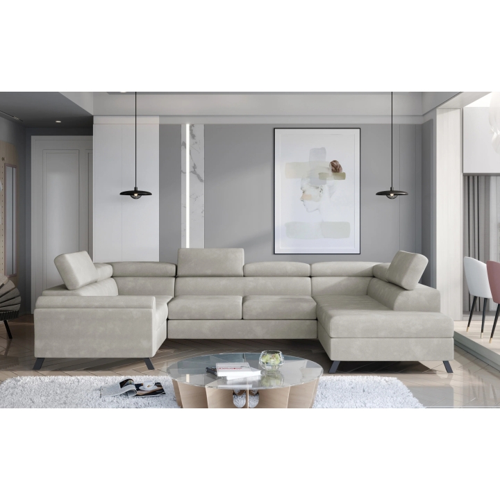 The Escada corner sofa by Eltap is anelaborate U-shaped model that offers an expansive space for relaxation and is the focal point of any living room. Its construction is based on a simple body, enriched with solutions that increase the comfort of everyday use. Noteworthy are the adjustable headrests and the high 6 cm metal legs in black, adding visual lightness to the entire form.