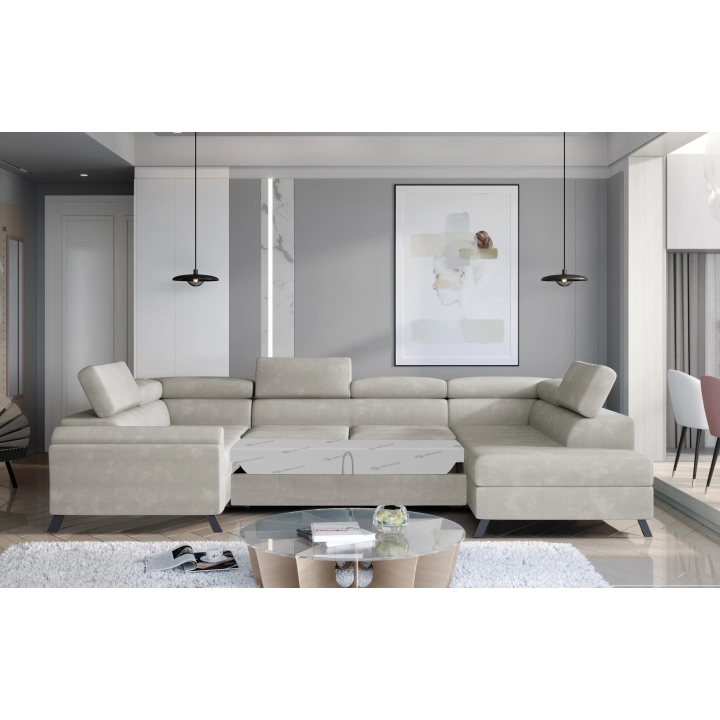 The Escada model is equipped with a dolphin-type sleeping function, which allows the corner sofa to be quickly transformed into a 125x253 cm night rest area. The mechanism works by extending the lower part and lifting the hidden mattress to the level of the seat, creating an even, uniform surface. An additional advantage is the bedding container, thanks to which blankets or pillows can be easily stored.