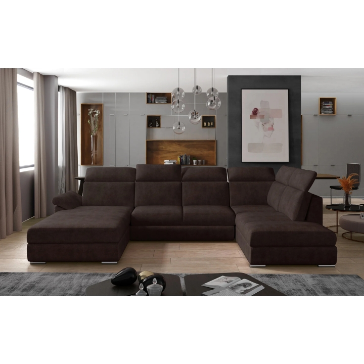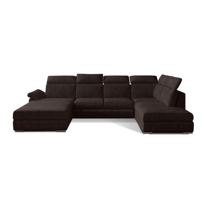 Both the left and right sides of the corner unit have equal depth, but differ in their use. On one side there is a side with an elongated seat and backrest supported by headrests, while the opposite side forms an elongated ottoman designed for completely straightening out the body. The ottoman is additionally equipped with a bedding storage compartment, which provides a useful place to store textiles.