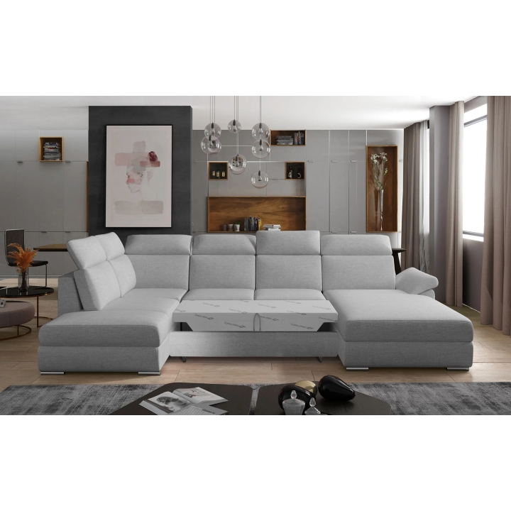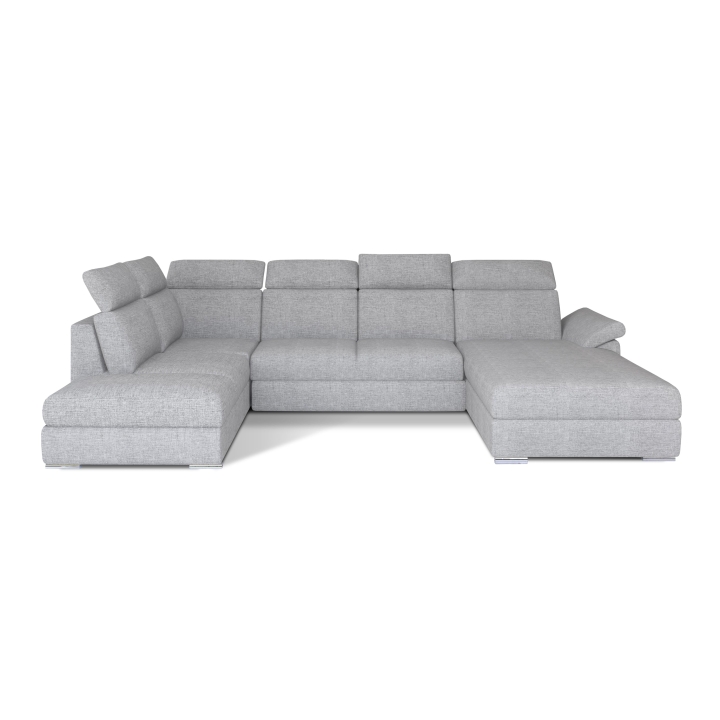 Both the left and right sides of the corner unit have equal depth, but differ in their use. On one side there is a side with an elongated seat and backrest supported by headrests, while the opposite side forms an elongated ottoman designed for completely straightening out the body. The ottoman is additionally equipped with a bedding storage compartment, which provides a useful place to store textiles.