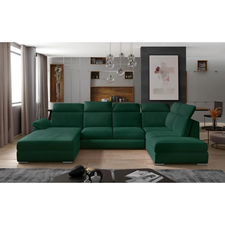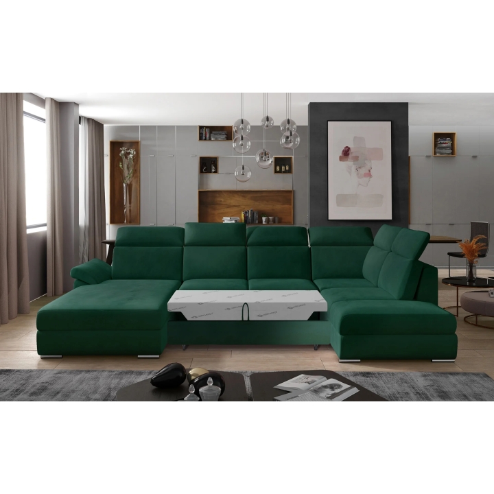Both the left and right sides of the corner unit have equal depth, but differ in their use. On one side there is a side with an elongated seat and backrest supported by headrests, while the opposite side forms an elongated ottoman designed for completely straightening out the body. The ottoman is additionally equipped with a bedding storage compartment, which provides a useful place to store textiles.