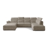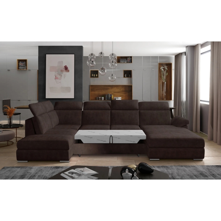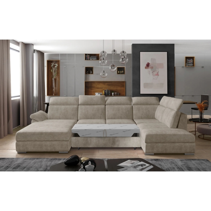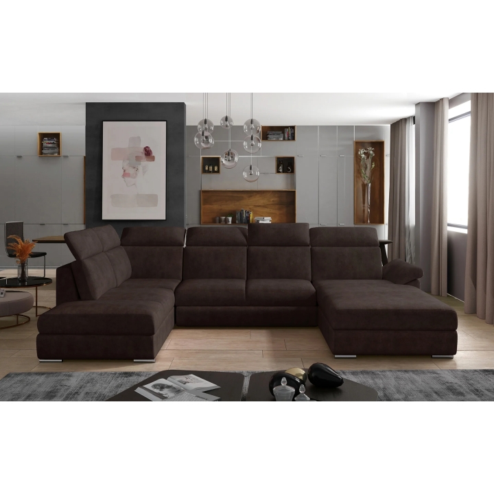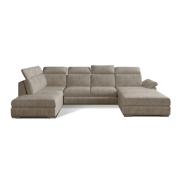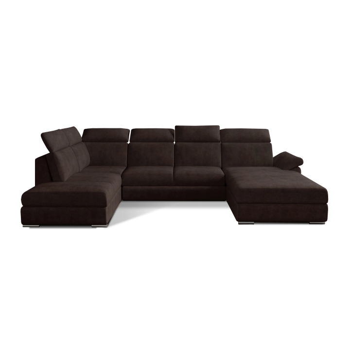 Both the left and right sides of the corner unit have equal depth, but differ in their use. On one side there is a side with an elongated seat and backrest supported by headrests, while the opposite side forms an elongated ottoman designed for completely straightening out the body. The ottoman is additionally equipped with a bedding storage compartment, which provides a useful place to store textiles.