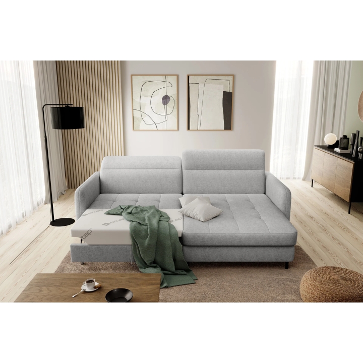 Gomsi is equipped with a dolphin-type unfolding mechanism that makes it possible to obtain a sleeping surface of 128x200 cm. Simply slide the lower part out from under the seat and lift the mattress to create an even sleeping area. As an added bonus, there is a built-in bedding container that opens with the support of the seat lift, allowing for convenient storage of textiles and easy access to them.
