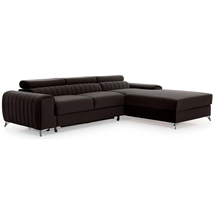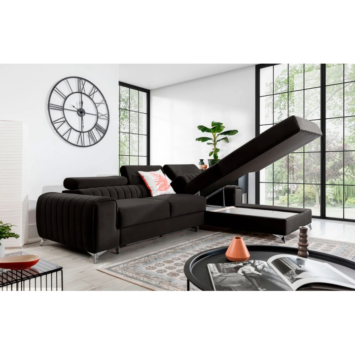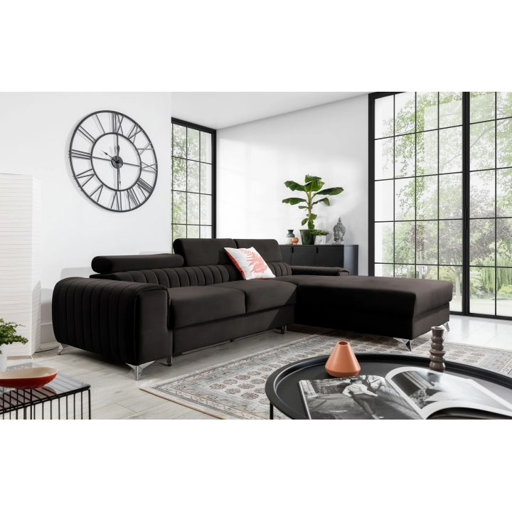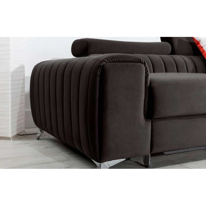 The contoured backrest, combined with adjustable headrests, makes it possible to adjust the arrangement to the user's individual needs. The whole is supported by solid steel legs, 9 cm high, which visually lift the body of the furniture, giving it slenderness. The use of metal also emphasises the contemporary character of the corner sofa.