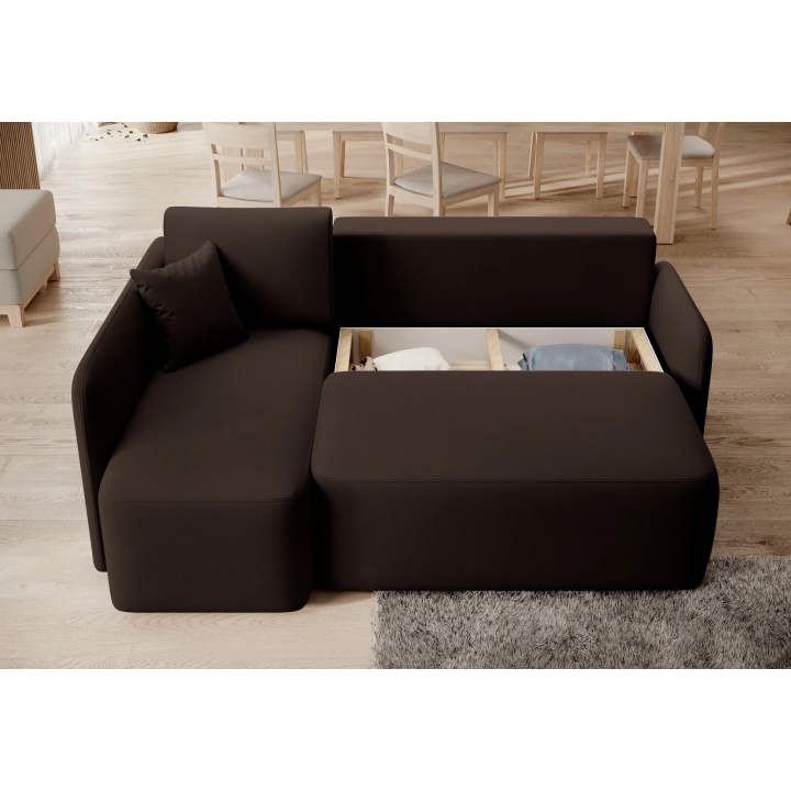 After pulling out the seat, the user gains access to the bedding compartment, which is discreetly hidden inside the furniture. Such a design is conducive to keeping things tidy - bedding, blankets or other textiles can always be at hand, but invisible to the eye. The Hadson Eltap corner sofa thus becomes a thoughtful choice for those who appreciate balanced form and clever solutions favouring better organisation of space.