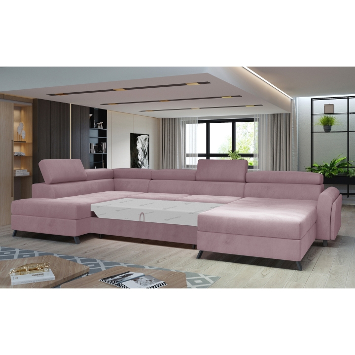 Also hidden in the corner sofa is a dolphin-type unfolding mechanism, which allows you to quickly obtain a sleeping surface of 123x296 cm. Simply slide out the bottom section and lift the mattress to create an even, stable sleeping surface. The opening ottoman has roomy storage for bedding, which will make it easy to keep your lounge area tidy.