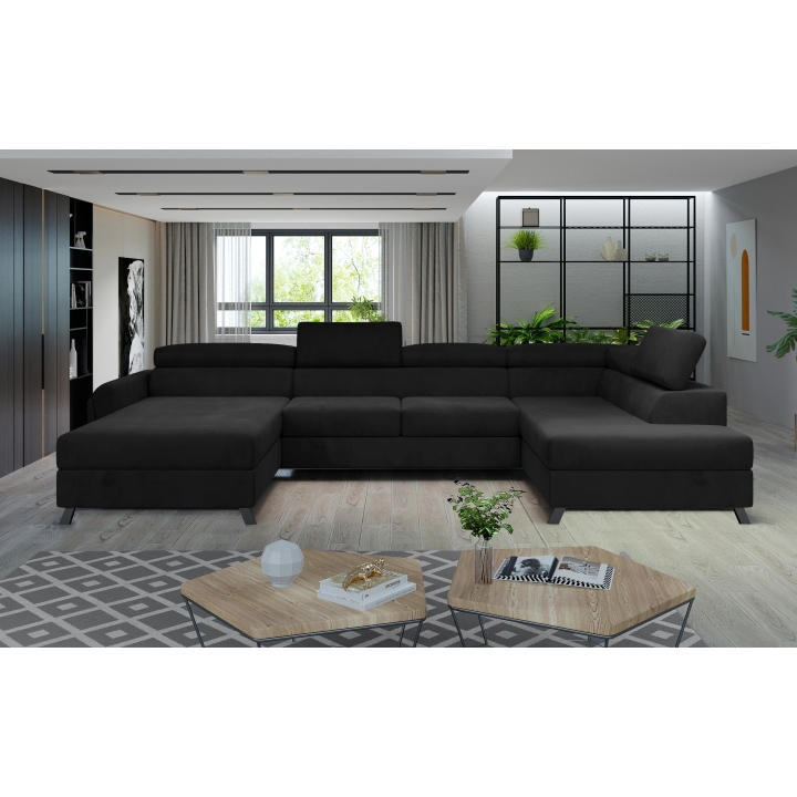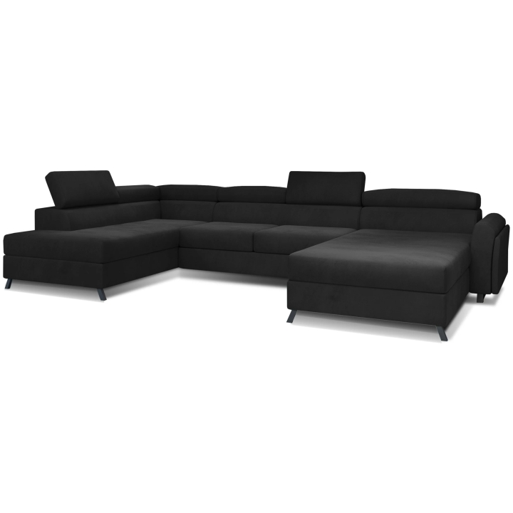 The base of the corner sofa is formed by 9 cm high black metal legs that subtly raise the structure above the floor. This detail gives the whole structure a lightness and fits in with the modern aesthetic, adding a slightly industrial expression. The low base and the compact piece of furniture 76 cm high (or 92 cm with raised headrests) create a harmonious silhouette with clearly defined lines.