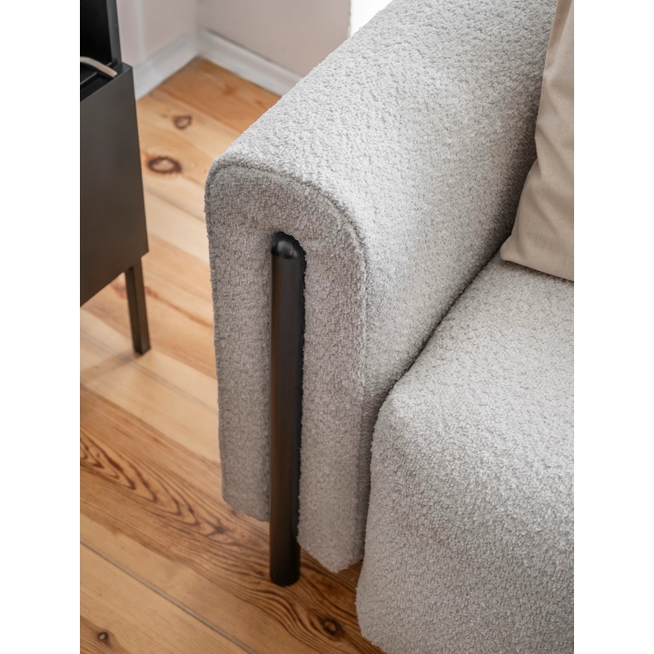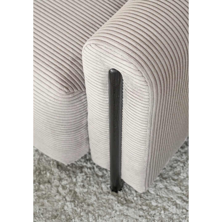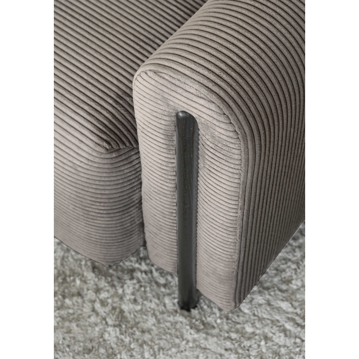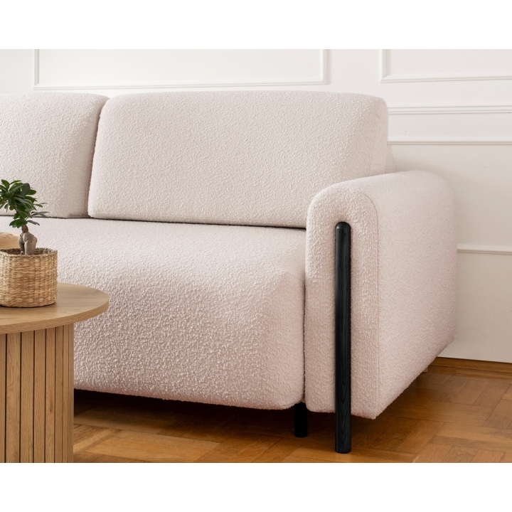 The black wooden legs are not only a structural element, but above all a decorative accent characteristic of the Arcadova collection. They are distinguished by their unusual arrangement - the front part flows smoothly into the front of the armrest, reaching a height of as much as 60 cm, which creates a visual framing effect and is one of the most recognisable motifs of the series. The entire armrest measures 67 cm in height, allowing the vertical leg element to almost enclose it. The other legs, located under the seat, are 12 cm high and support the entire structure