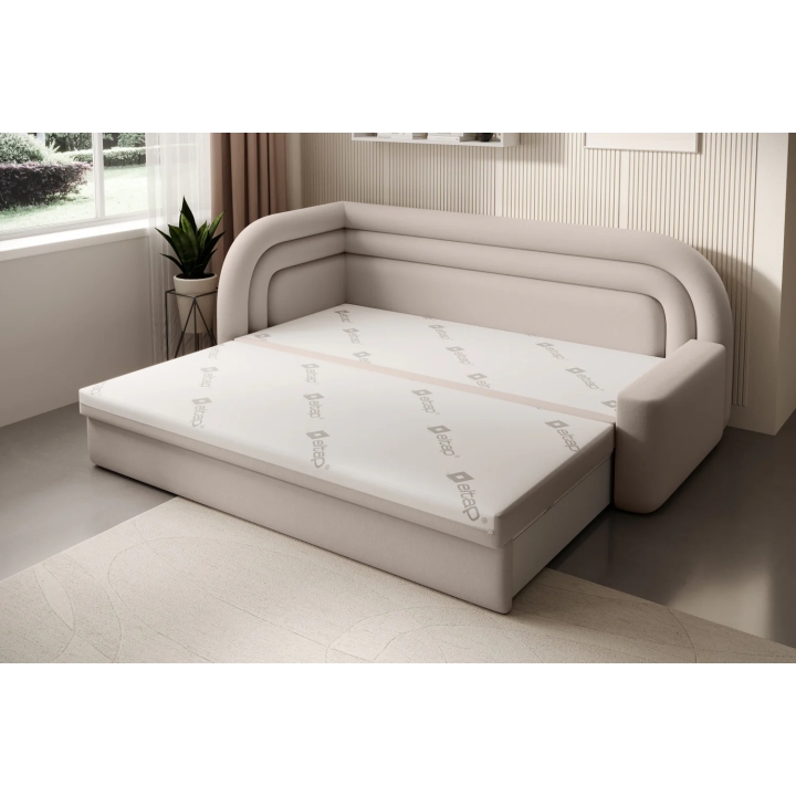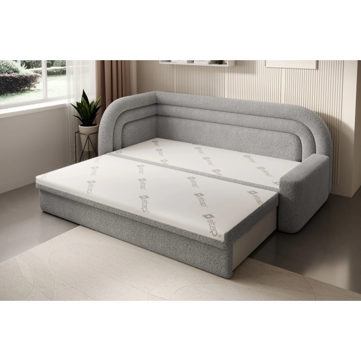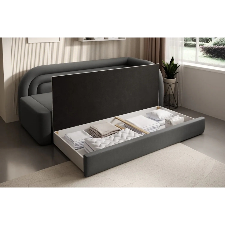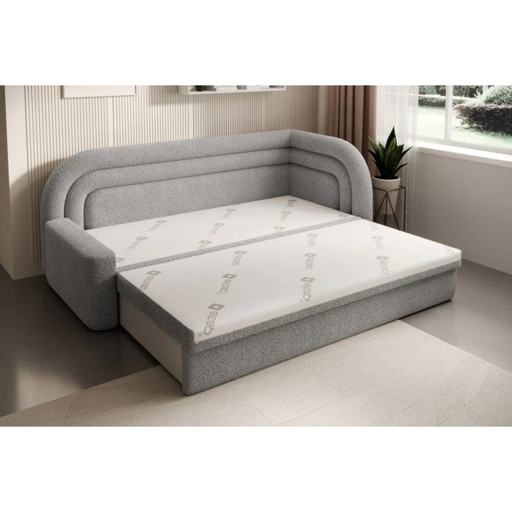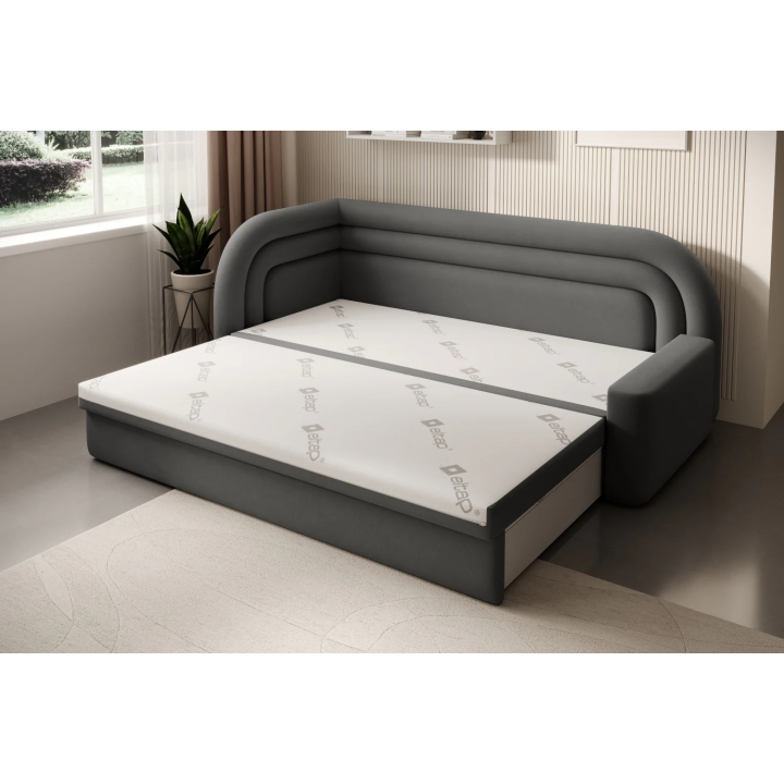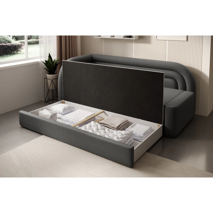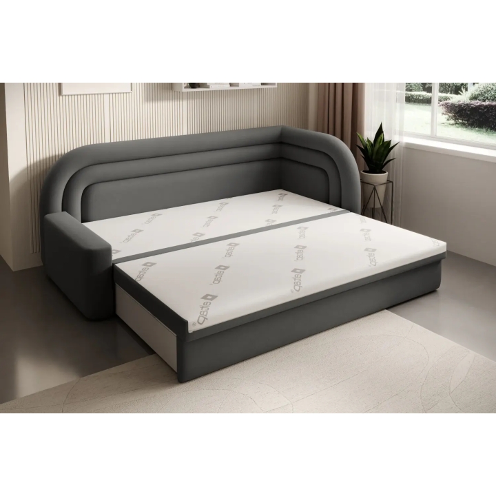 The sofa also offers the possibility of converting into a bed - it is equipped with a dolphin-type mechanism that allows the 135x199 cm sleeping surface to be quickly unfolded. The mechanism is based on rubberised rollers that prevent scratching the floor and ensure smooth operation. The entire unfolding process requires little effort and can be carried out without the help of a second person.