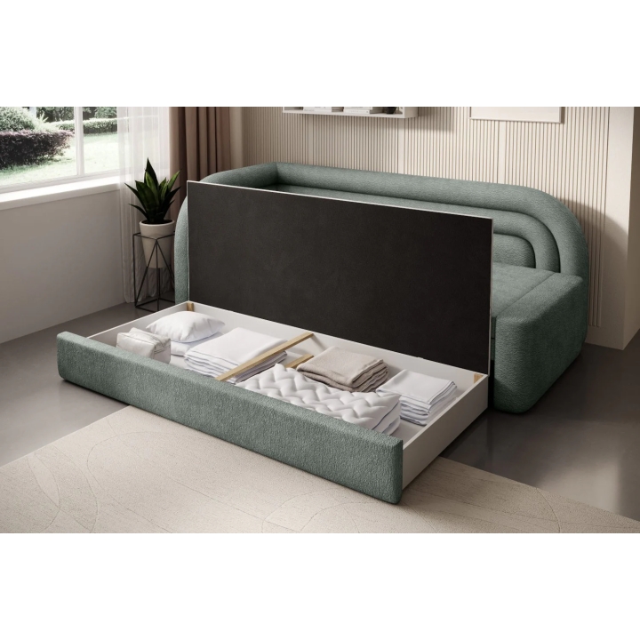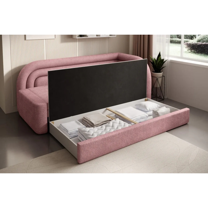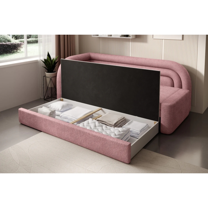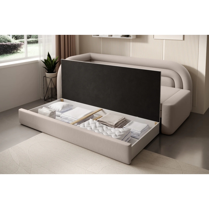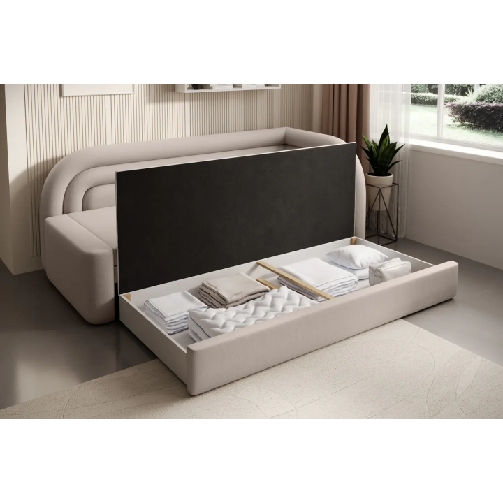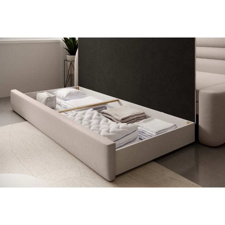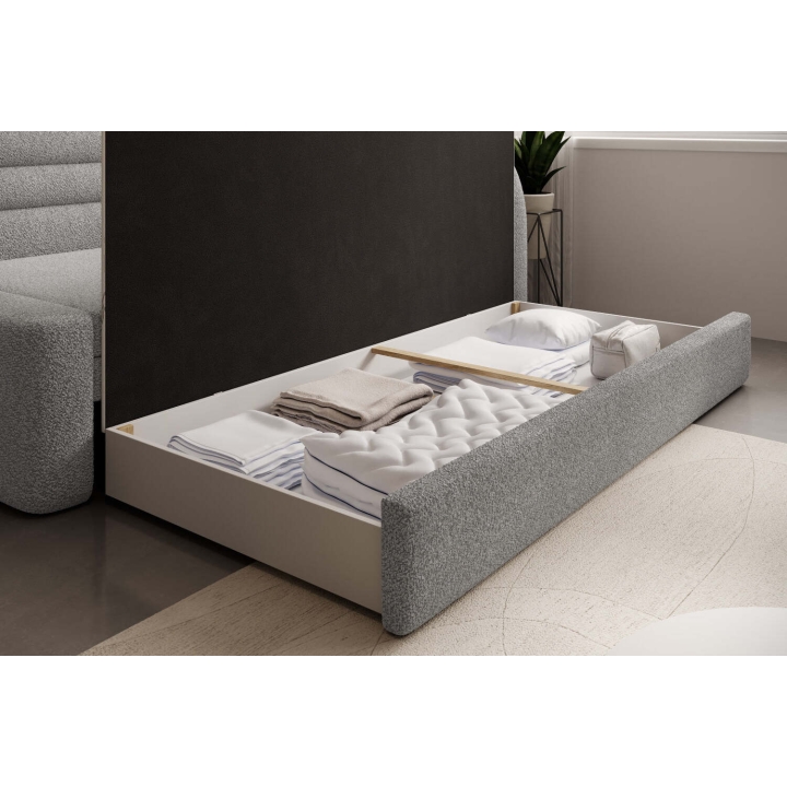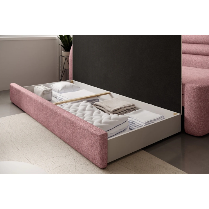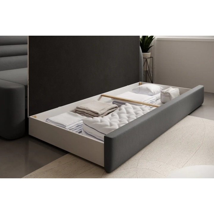In addition, there is a bedding container under the seat, allowing you to store blankets, cushions or duvets. The generous storage space helps to keep the room tidy, without the need for additional furniture. This clever solution makes it easier to organise the space in the youth room or living room on a daily basis.