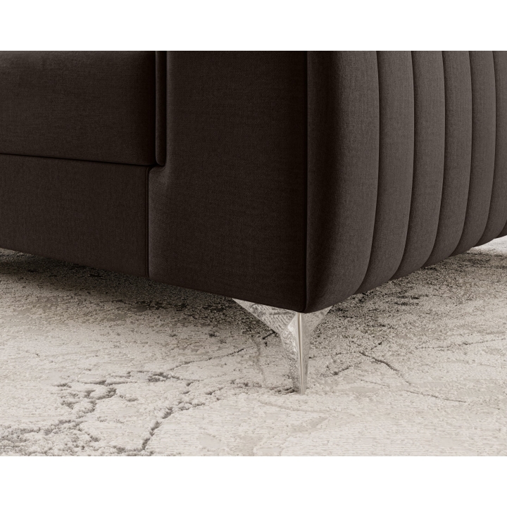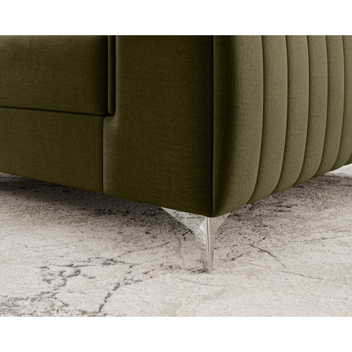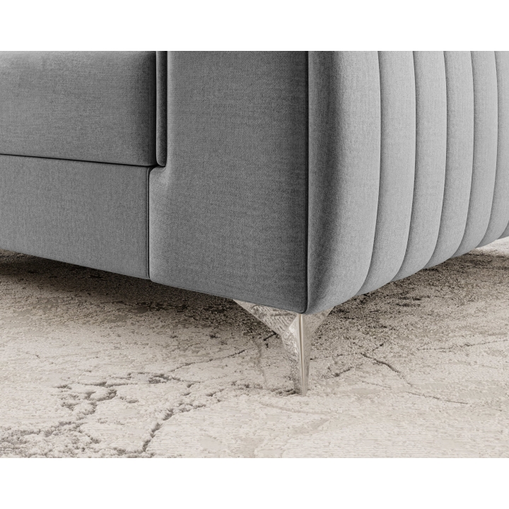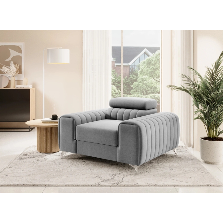 The model is set on slender silver-tone steel legs, 9 cm high, allowing free access to the space underneath the furniture. This solution makes the armchair visually light and subtly blends in with its surroundings. The metallic sheen of the base gently contrasts with the soft upholstery, creating an interesting aesthetic effect.