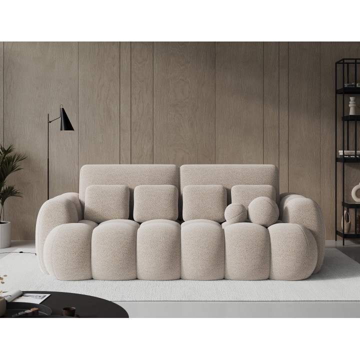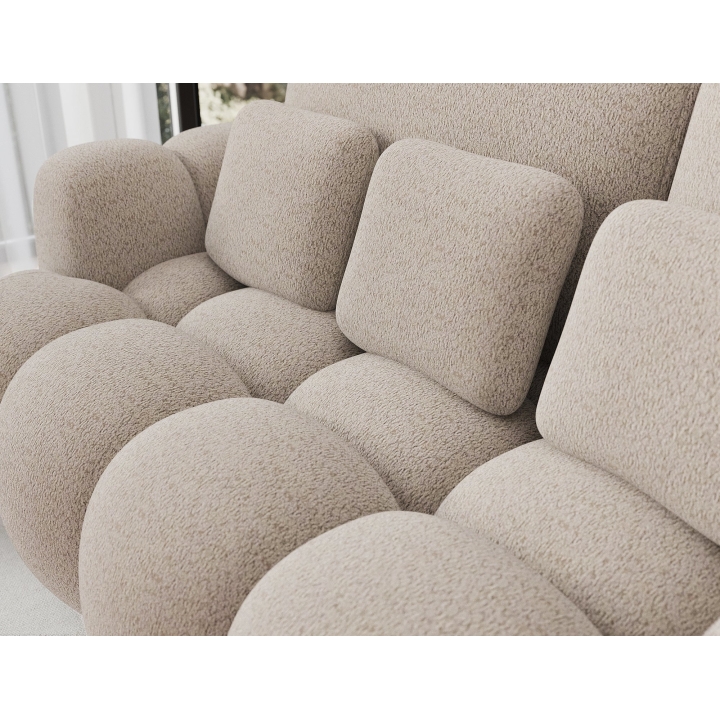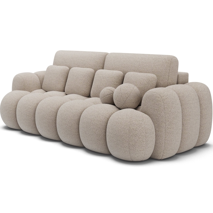 The proportions applied, i.e. 256 cm wide, 105 cm high and 119 cm deep, provide ample seating space. The backrest is made up of 2 large cushions measuring 95x53 cm, 4 smaller rectangular c ushions measuring 40x33 cm and 2 cushions in the form of balls, which are an original decorative element and give the whole a unique character. The whole combination of cushions introduces depth and allows you to freely adjust the way you sit.