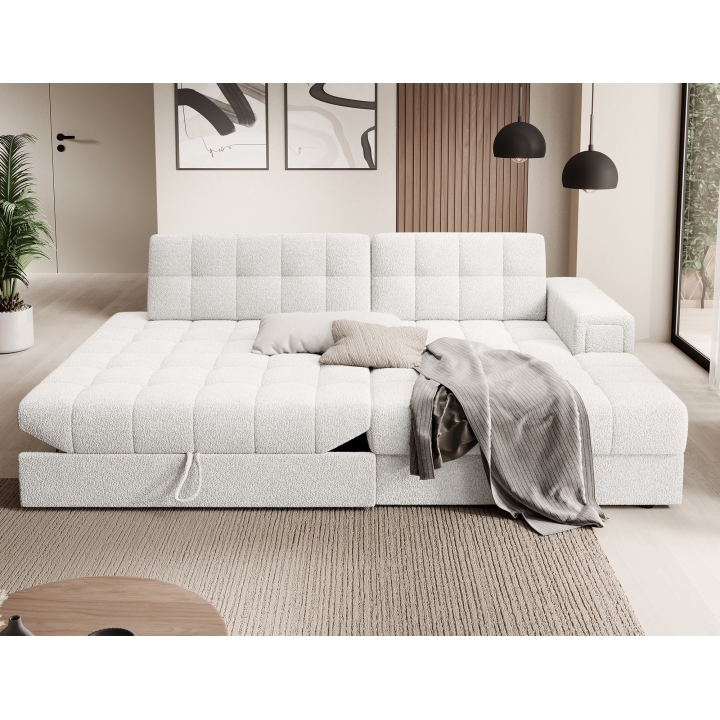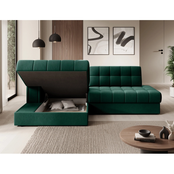 The Blezalt model is equipped with a spacious sleeping surface measuring 215 × 124 cm. Its unfolding is quick and intuitive thanks to the dolphin mechanism. To convert the piece of furniture into a bed, simply slide out the lower part of the structure and then lift the hidden mattress, which automatically aligns with the level of the seat, creating an even and comfortable sleeping space. The clever form of unfolding makes the transformation of the sofa into a bed quick and effortless. There is also a concealed bedding container inside the corner sofa, the opening of which is facilitated by a spring-loaded lift - an important detail, especially with frequent use of the sleeping function.