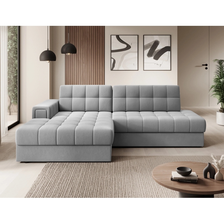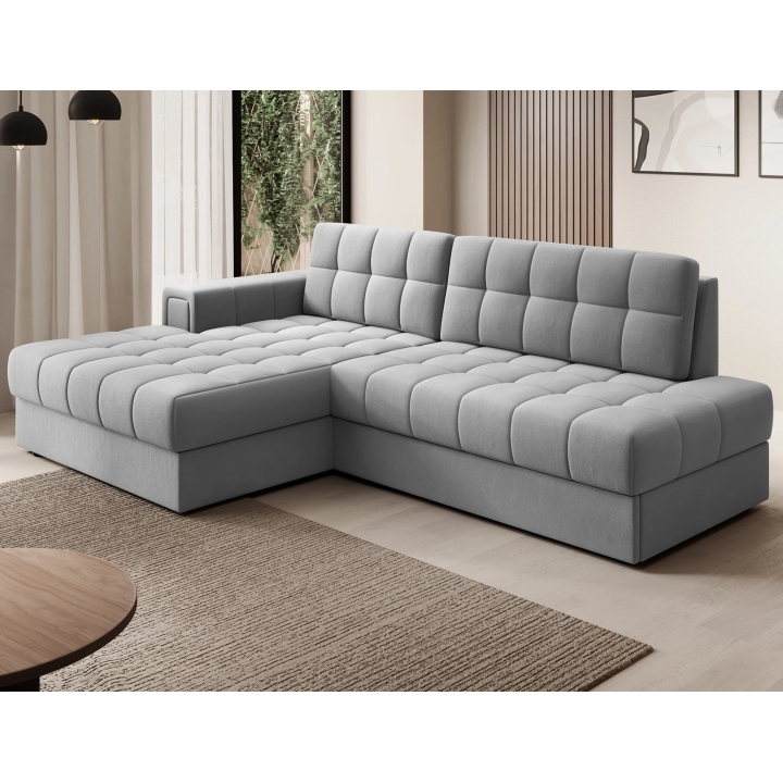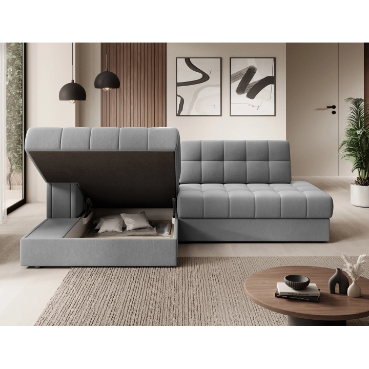 The Blezalt model is equipped with a spacious sleeping surface measuring 215 × 124 cm. Its unfolding is quick and intuitive thanks to the dolphin mechanism. To convert the piece of furniture into a bed, simply slide out the lower part of the structure and then lift the hidden mattress, which automatically aligns with the level of the seat, creating an even and comfortable sleeping space. The clever form of unfolding makes the transformation of the sofa into a bed quick and effortless. There is also a concealed bedding container inside the corner sofa, the opening of which is facilitated by a spring-loaded lift - an important detail, especially with frequent use of the sleeping function.