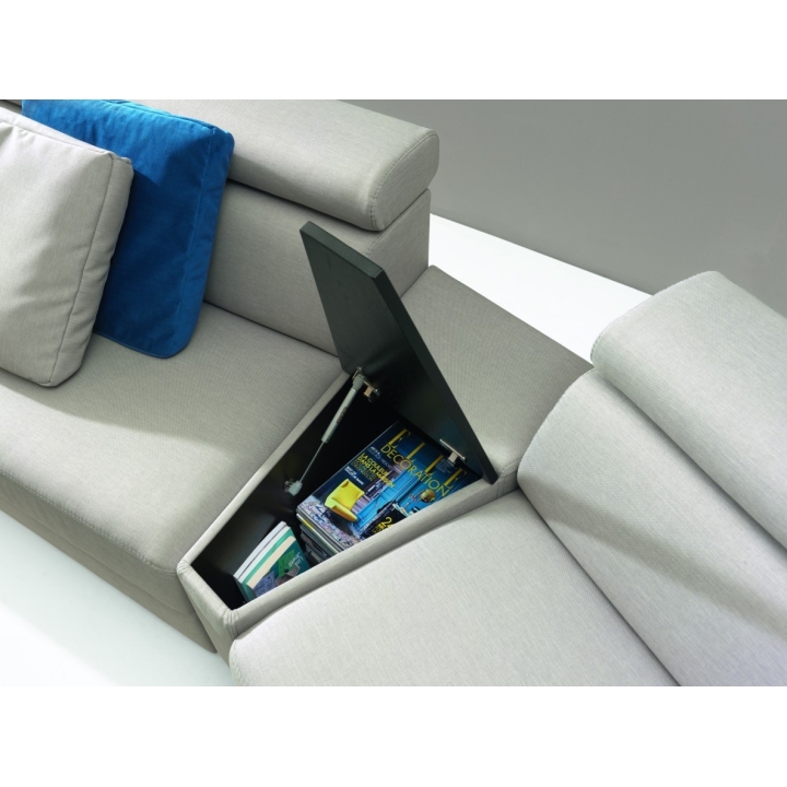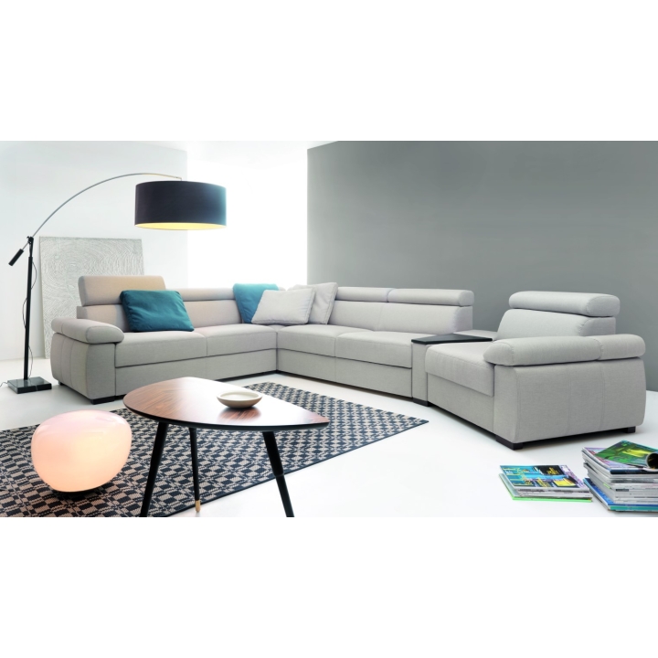 The Zoom sofa by Etap-Sofa is a piece of furniture created for people for whom it is important to combine perfect workmanship with incredible functionality. Its original design will delight everyone. The corner sofa has a sleeping function and a bedding container in the form of a drawer. The comfort of the furniture is certainly enhanced by the adjustable headrests, thanks to which you can rest your head comfortably. An interesting solution is the use of the TT element, which makes the arrangement of the corner unit slightly curved. The TT element has a lift-up shelf and a storage compartment.