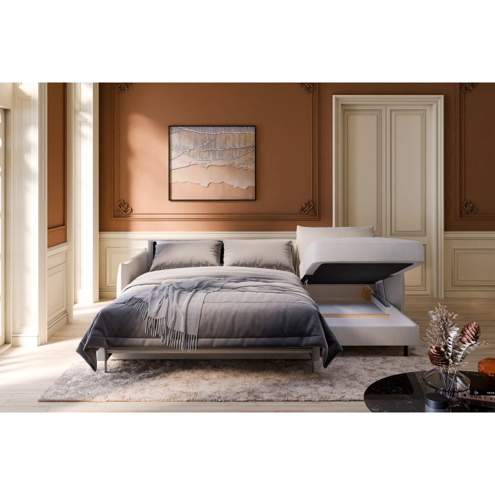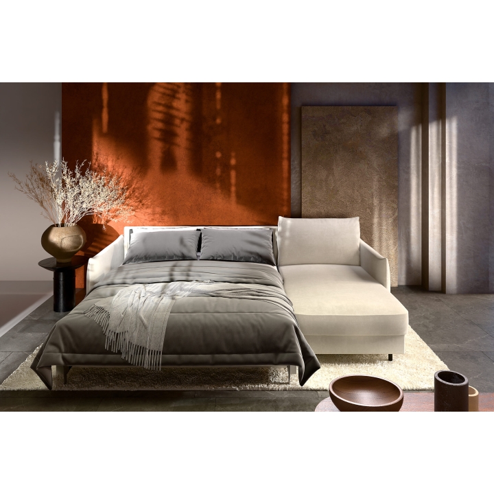 The model also offers a sleeping function with an Italian frame mechanism, providing a stable and comfortable sleeping surface. The sleeping area measures 140 × 190 cm, offering ample space for one or two people. The seat height is 50 cm, the seat depth 58 cm, and the backrest height 42 cm, ensuring a pleasant sitting posture.